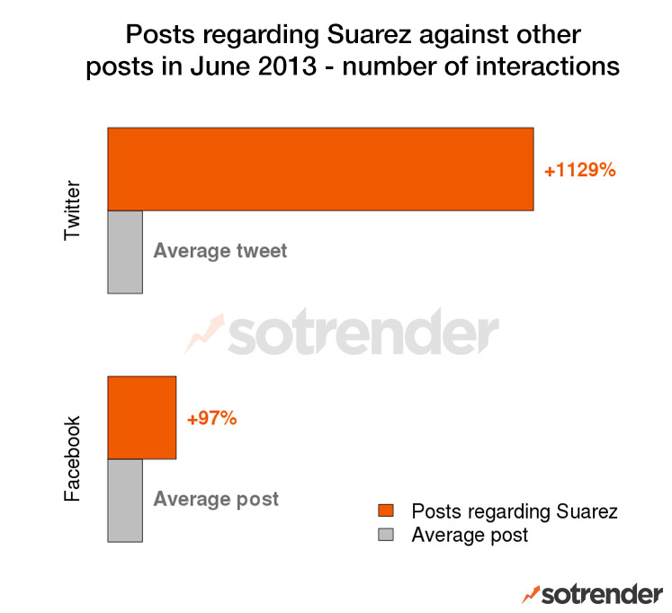 In the 79th minute of World Cup game Uruguay – Italy Luis Suarez bit his Italian opponent Giorgio Chiellini. For Suarez, one of the biggest stars of nowadays soccer, it was the 3rd biting over last years! No wonder, the Internet memes flourished immediately. Furthermore, many brands tried to use this incident for their own real-time marketing, aiming at hijacking the news and attracting the interest. Analysis of Sotrender proved that real-time marketing in social media really worked, bringing very unprecedented high engagement. Moreover, the study enabled us to find the factors which helped the most on Twitter and Facebook – the real-time marketing social recipe for success.