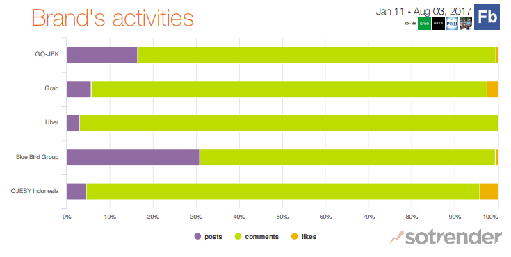As for Facebook specifically, we can see that the types of Brand Activities are mainly commenting with posting varying anywhere between 3% (Uber Indonesia) and 30% (Blue Bird Group) of total activities. Neither is necessarily better than the other however generally more engagement from a brand builds more rapport and trust with the customers and has a better overall image in the eyes of end users as being closer to them.