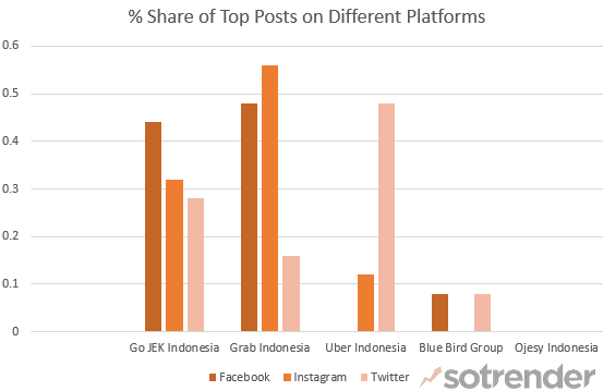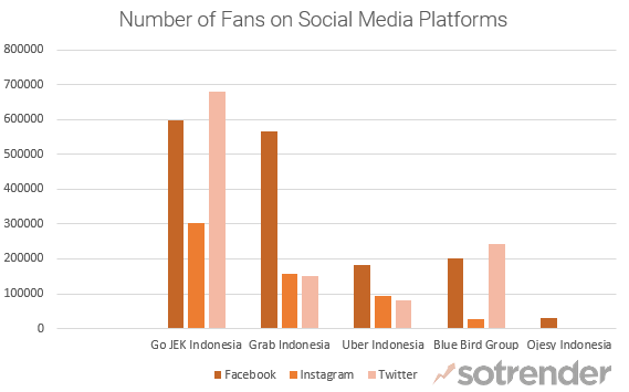 We can see below that Go-JEK (GoJEK) Indonesia dominates in terms of how many fans are present on different social media platforms ranging from Facebook, Twitter and Instagram – showing it’s ubiquitous presence and influence in Indonesia. Next comes Grab Indonesia, Blue Bird Group and Uber followed in the end by Ojesy Indonesia.