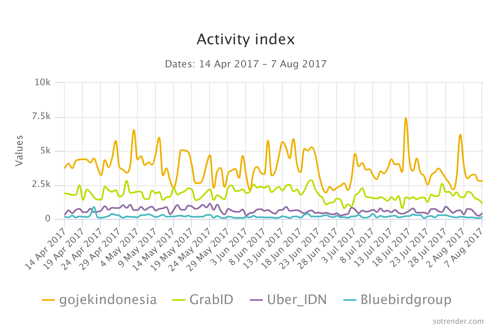 Ride Sharing Tech Apps in Indonesia – Average # of Daily Brand Activities (January – July 2017)