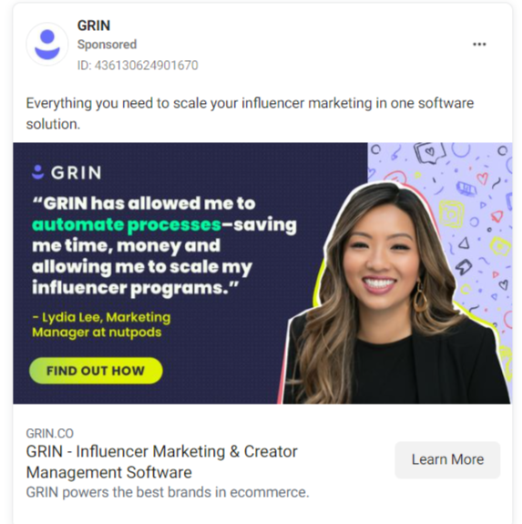 Examples of social proof are customer testimonials, customer lists, product reviews, or even quantifiable data (Ex: 2 million downloads). In this below example, Grin, a software company, is advertising a customer testimonial.