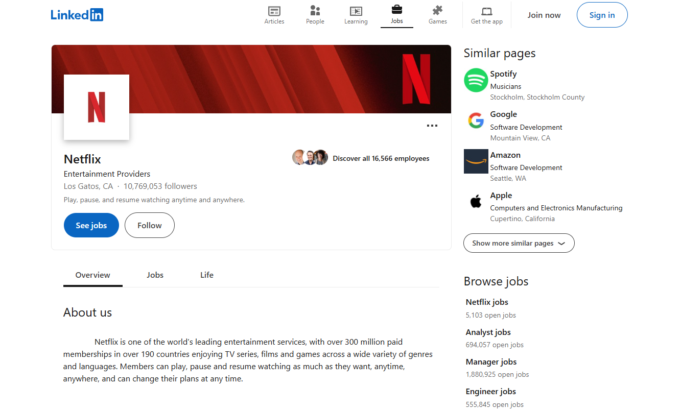 For example, social media monitoring software Netflix’s LinkedIn bio is short and communicates what the tool does in just one short sentence. The brand describes its product and mentions the target roles (like managers and engineers). The profile also mentions they can “change their plans at any time” to sweeten the deal.