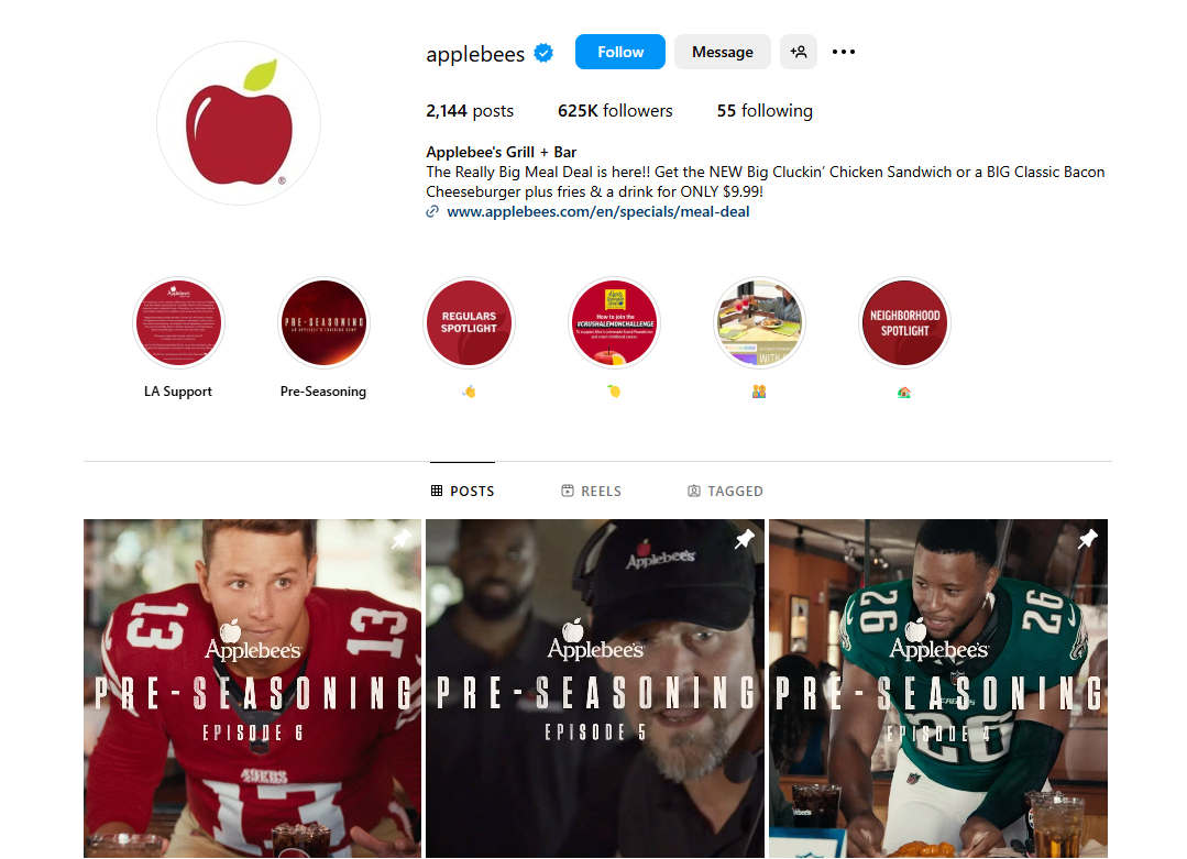 Applebee’s Instagram page is an excellent example of an optimized social handle. Their bio talks about the brand’s ongoing deal. There is also a direct link to the special offer page.