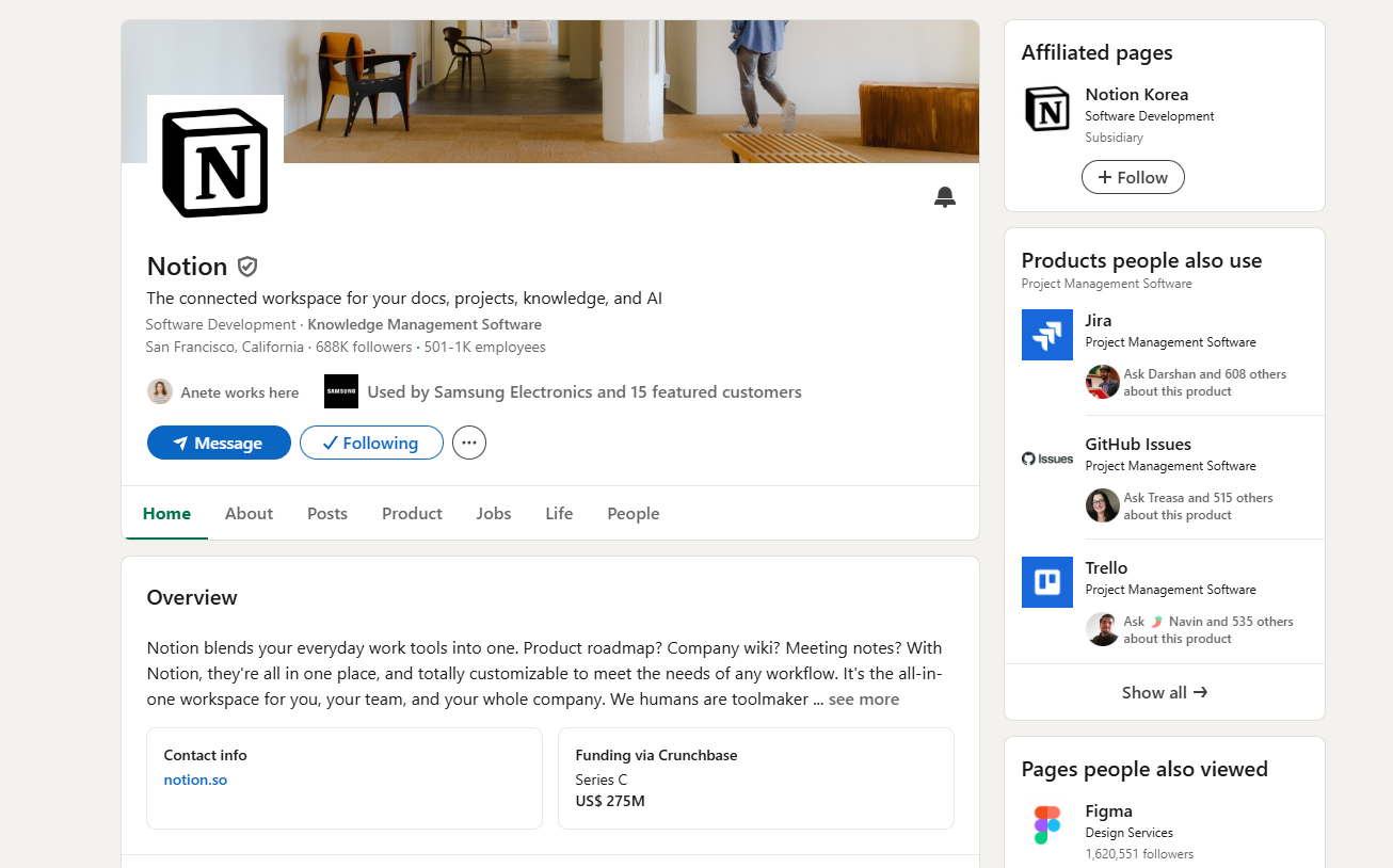For example, here is Notion’s LinkedIn profile. The overview is informative and SEO optimized for better discoverability.