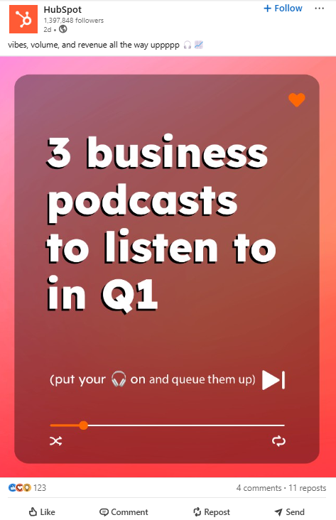 For example, staying true to popular marketing expertise, HubSpot posts informational content on industry topics. The posts are short, catchy, and deliver value.