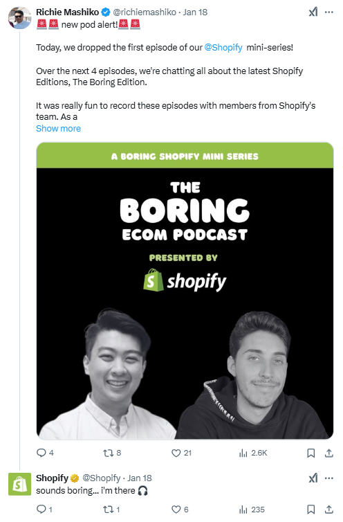 For example, an X user tweeted the launch of their podcast series on Shopify. Staying true to their brand’s playful personality, Shopify replied.