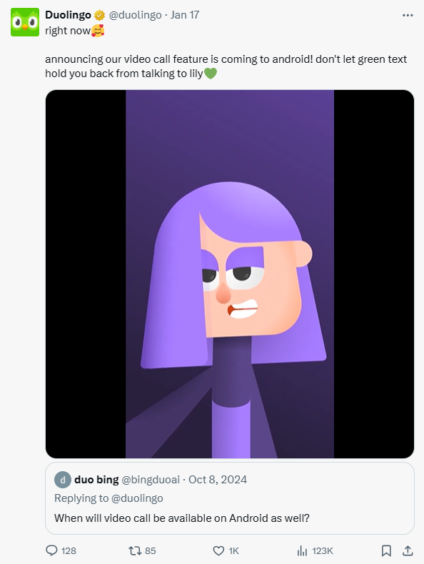 Duolingo also has a thriving community of language learners on X. The brand replies to tweets and customer requests in their signature quirky style.