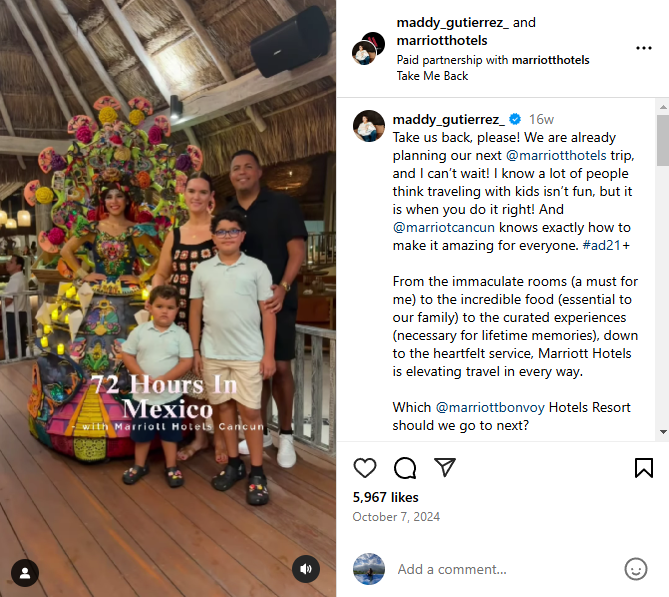 For example, JW Marriott partnered with popular lifestyle influencer Maddy Gutierrez on the above post. The creator documented the 3 days they spent in the Marriott Hotel Cancun and how much they enjoyed their stay.