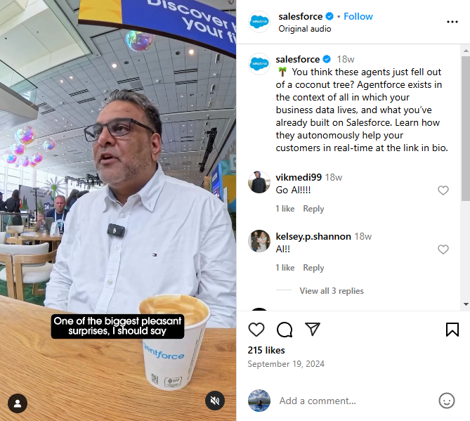 Salesforce asks for testimonials from their users attending the brand’s events and compiles them into Instagram videos. For example, users talk about how Agentfirce, a customizable AI agent created by Salesforce, streamlined their customer service and other business operations.