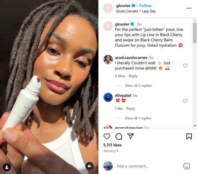 Glossier is a master of UGC marketing on social media. Most of their feed features real customers using their products. The posts are authentic and showcase the products’ value effectively.