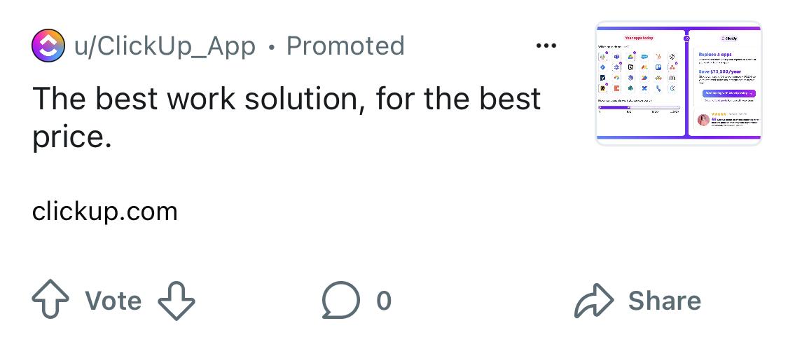 If you are a B2B brand, target platforms like Reddit and LinkedIn. For example, here is a straightforward Click Up ad on Reddit.