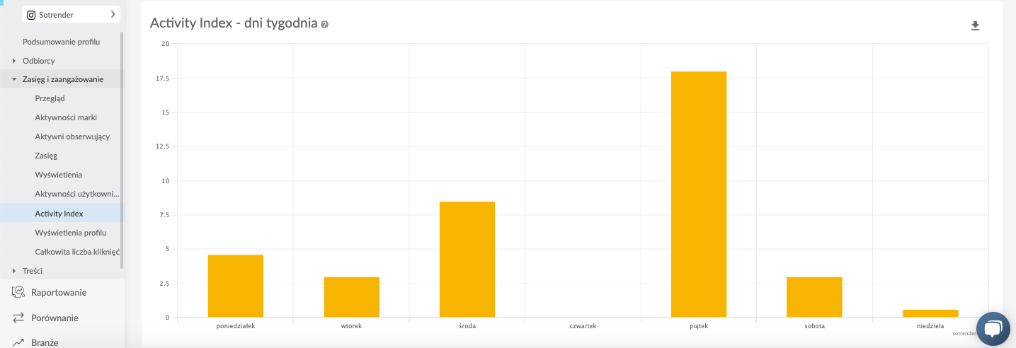 Activity Index jest dostępny w Sotrenderze w zakładce Zasięg i zaangażowanie, po wyborze interesującego profilu, zarówno dla profili własnych, jak i konkurencji.