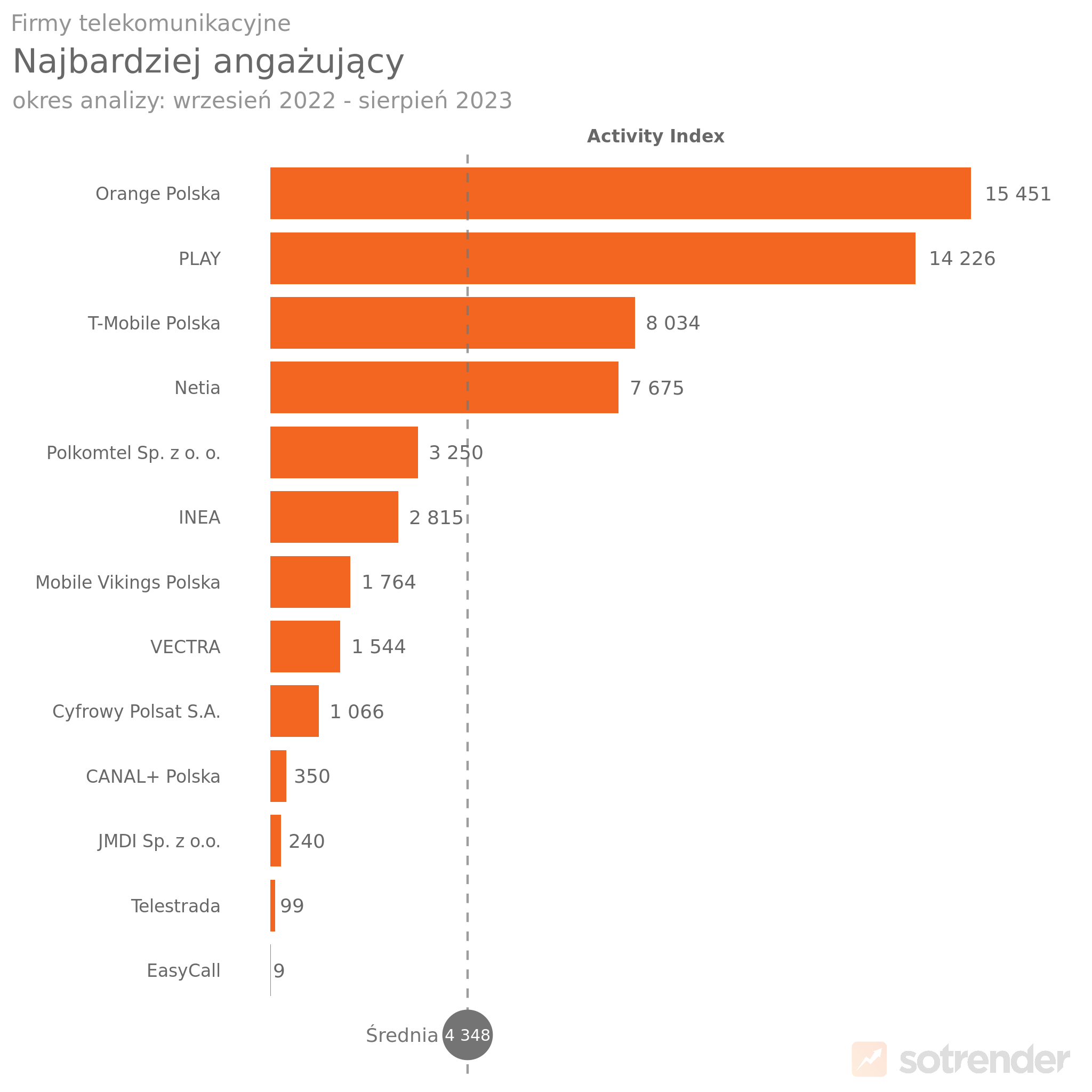 Stąd też pod względem Activity Index, naszego autorskiego wskaźnika, w którym różne aktywności użytkowników mają różne wagi – a udostępnienia są najbardziej wartościowe, liderem był Orange.