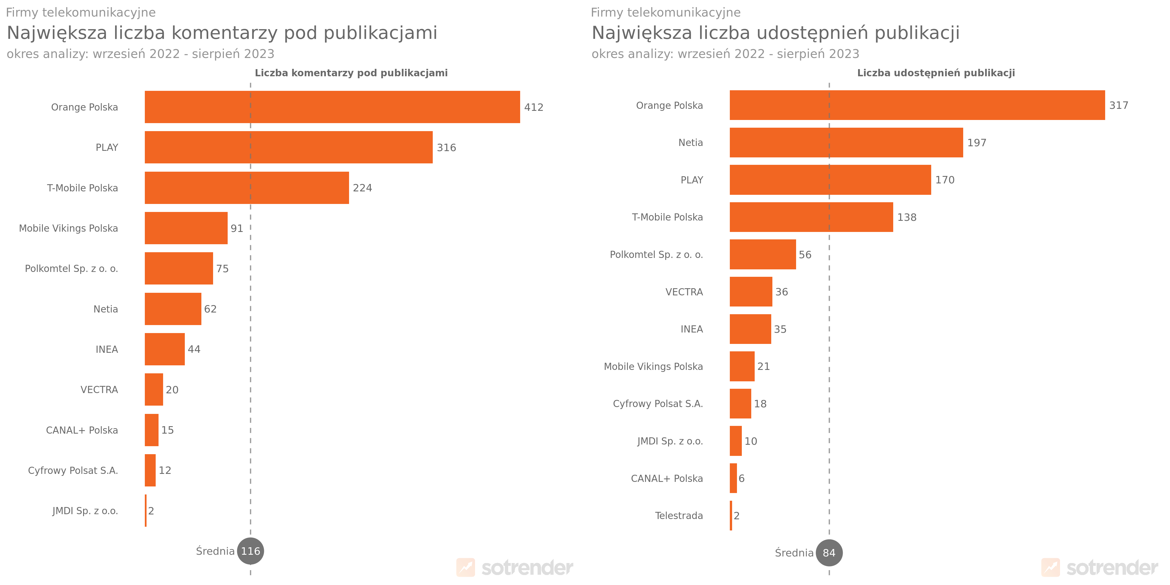 Strony na LinkedInie w kategorii telekomunikacja o największej liczbie komentarzy i udostępnień, wrzesień 2022 – sierpień 2023