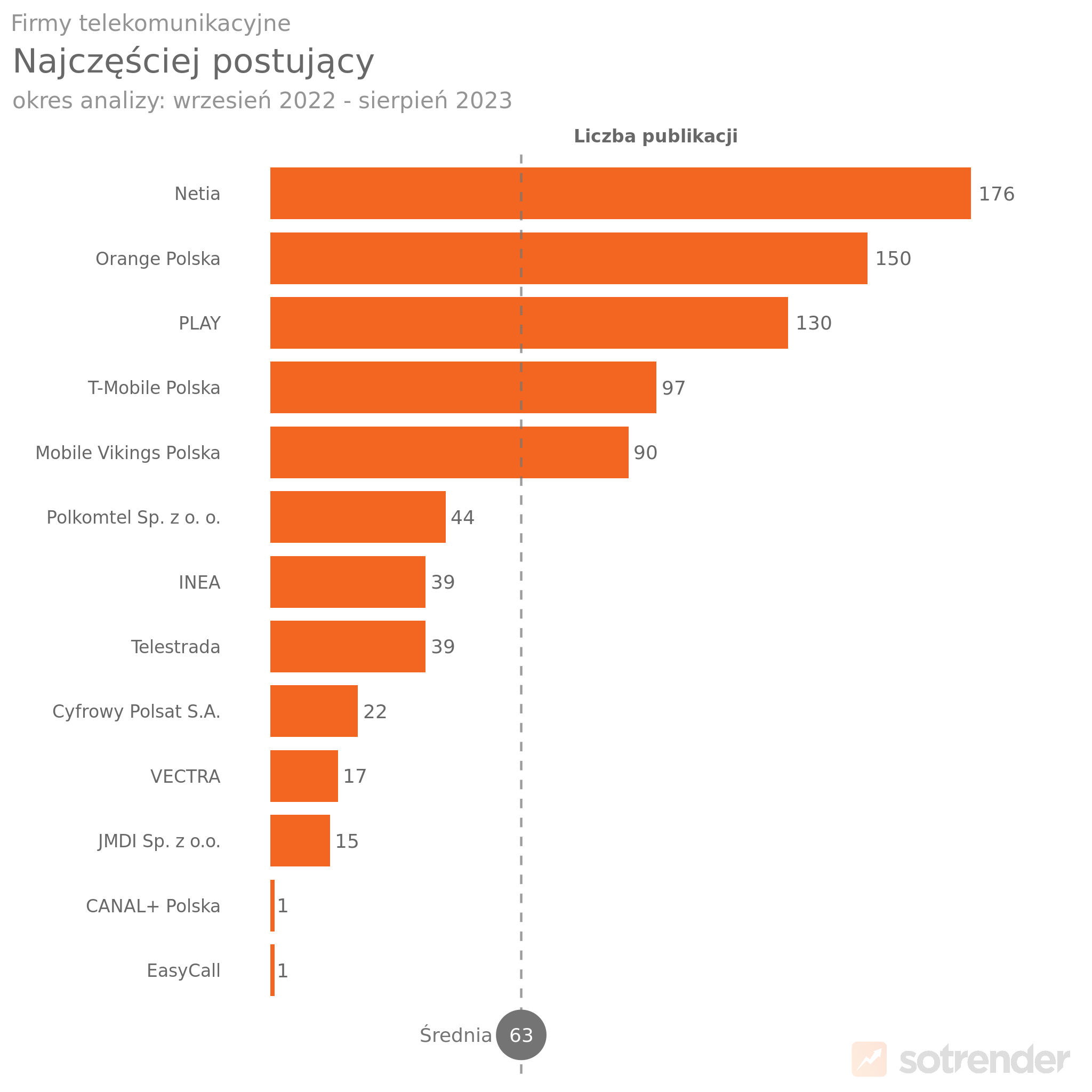 Najwięcej publikacji od września 2022 roku do sierpnia 2023 roku pojawiło się z kolei na profilu Netii – 176. Oznacza to, że średnio co dwa dni pojawiały się na nim nowe treści.