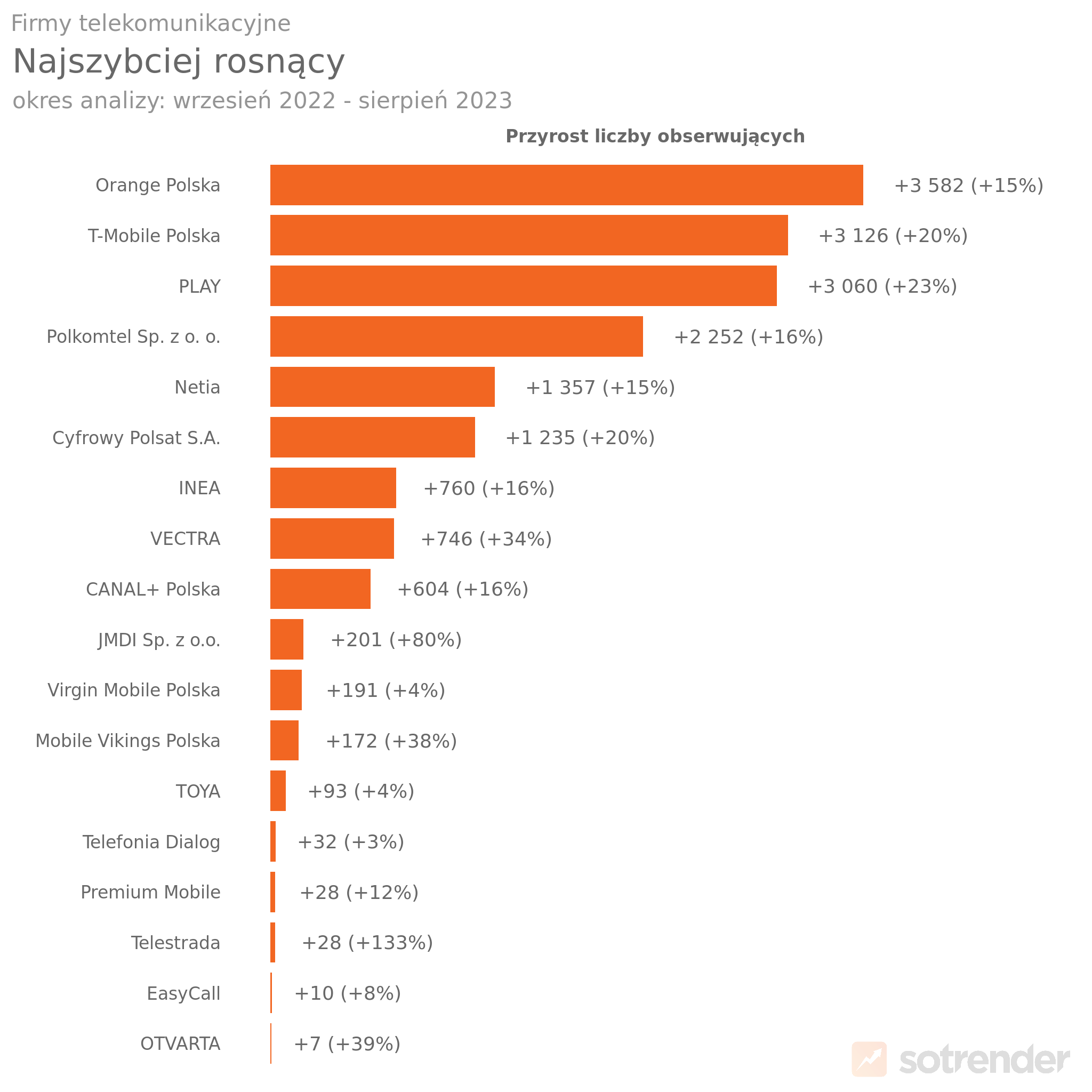 Na przestrzeni ostatnich 12 miesięcy to także profil Orange Polska rósł najszybciej. W ciągu roku na profilu przybyło ponad 3,5 tys. nowych obserwatorów. W podobnym tempie rosły profile T-Mobile oraz PLAY.
