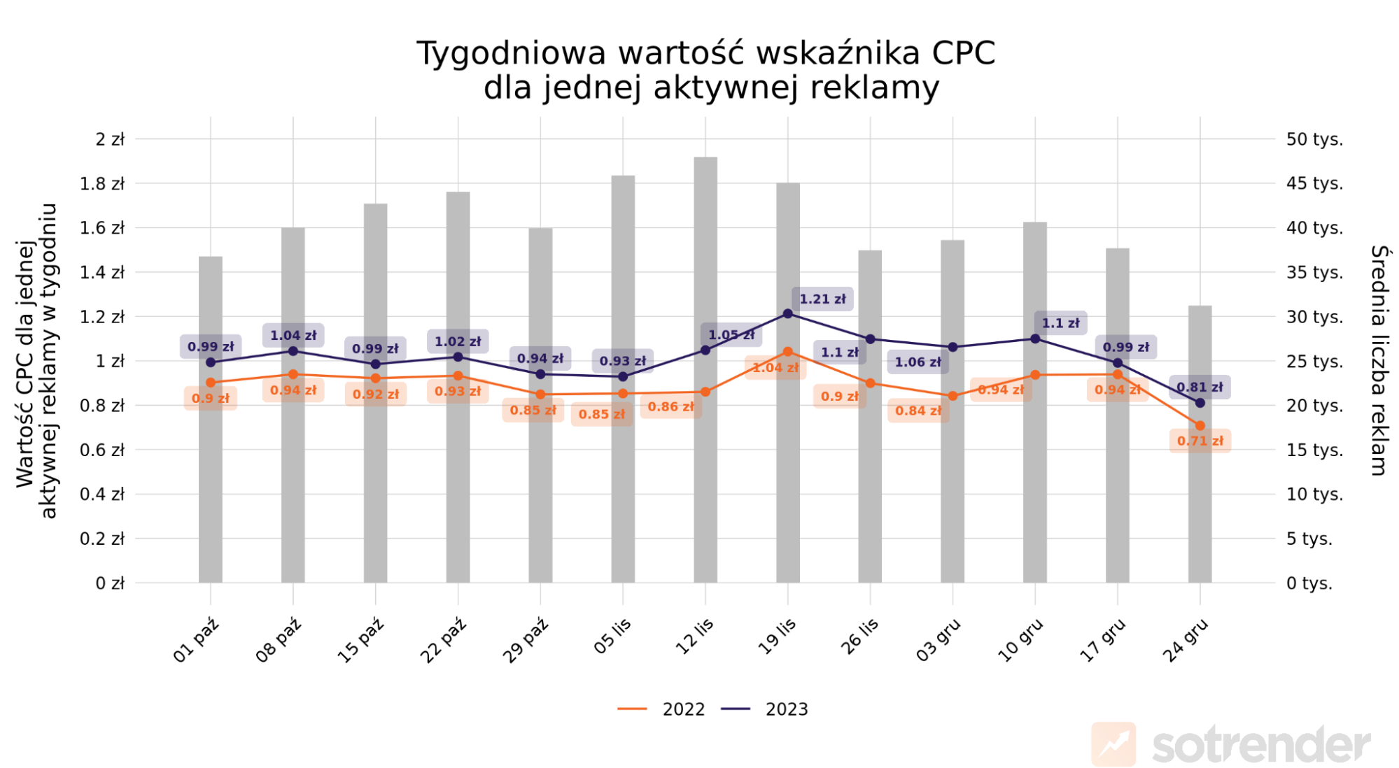 Z kolei znaczny spadek w liczbie reklam następuje zwykle w okolicach 18 grudnia, czyli na tydzień przed Świętami Bożego Narodzenia. W całym Q4 najmniej reklam będzie w ostatnim tygodniu roku. Wtedy też średni wskaźnik CPC i CPM przyjmie najniższą wartość.