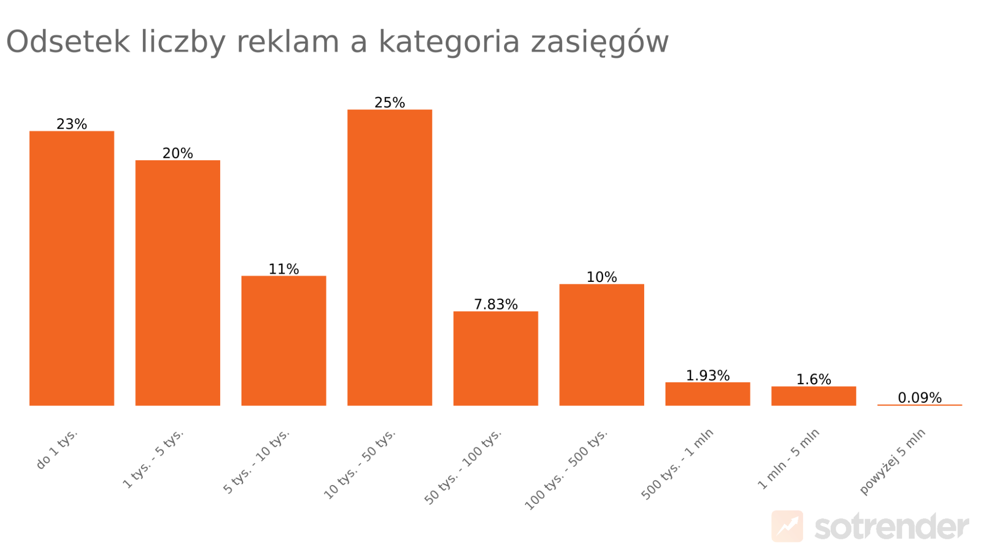W całym ekosystemie Meta najwięcej, bo 25%, było reklam o zasięgu w przedziale 10-50 tys. Nieco ponad 1,5% reklam miało zasięg wyższy niż milion.