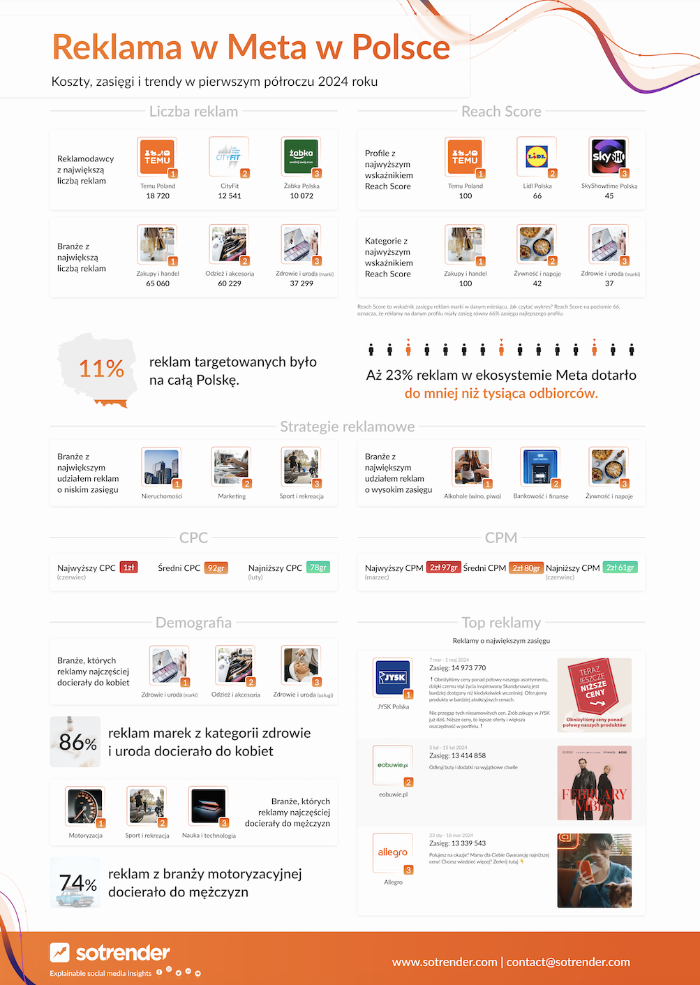 - W pierwszym półroczu 2024 roku największą liczbę reklam opublikowało Temu Poland (ponad 18 tys. reklam), i osiągnęło najwyższy wskaźnik Reach Score.