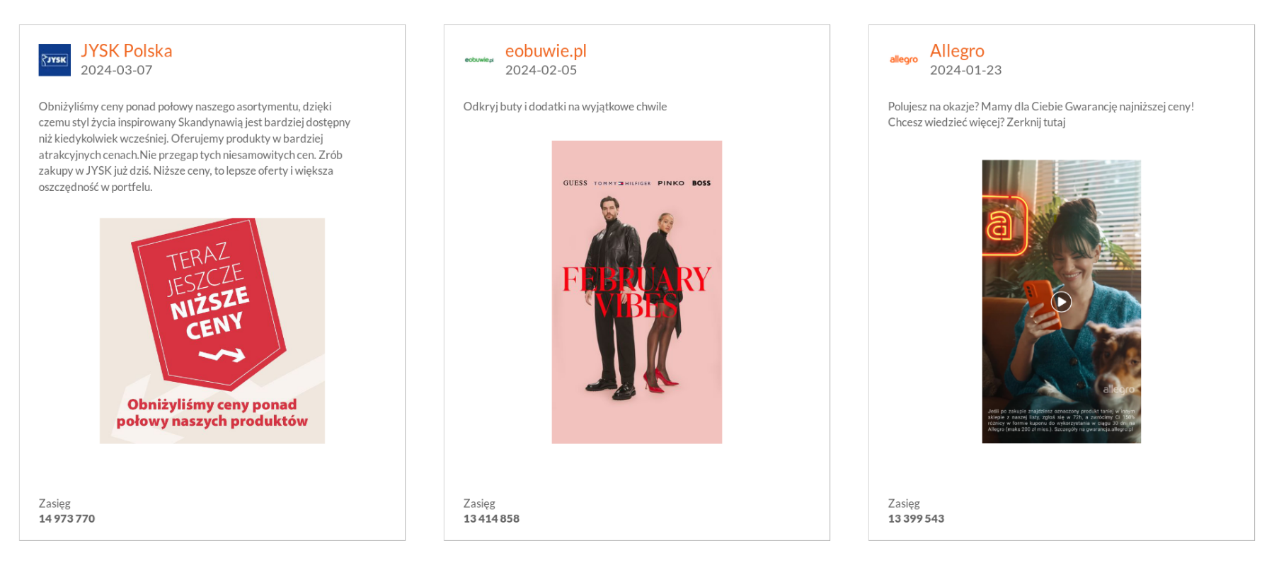 Reklamę o największym zasięgu opublikował JYSK Polska informujący klientów o obniżeniu cen swoich produktów. Na drugim miejscu znalazła się walentynkowa reklama eobuwie.pl, a na trzecim reklama Allegro. Wszystkie te reklamy zostały opublikowane w pierwszym kwartale.