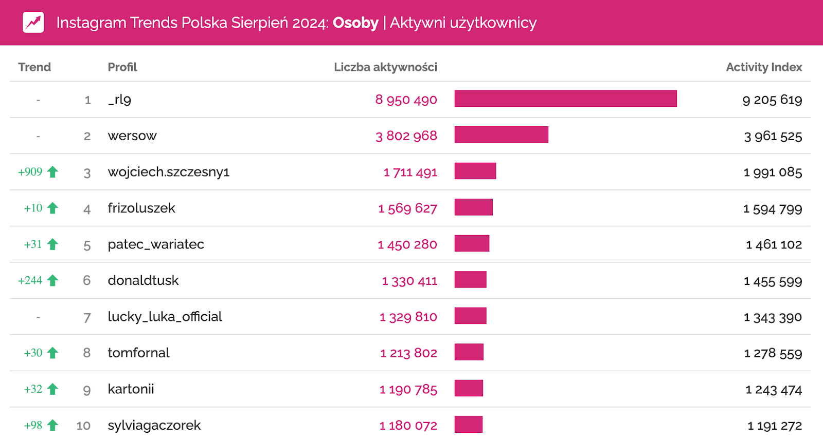 W czołówce znalazł się również Tomasz Fornal, który po zdobyciu srebrnego medalu na Olimpiadzie przyciągnął 102 tysiące nowych obserwujących, co ulokowało go na 3. miejscu wśród najszybciej rosnących profili sierpnia.