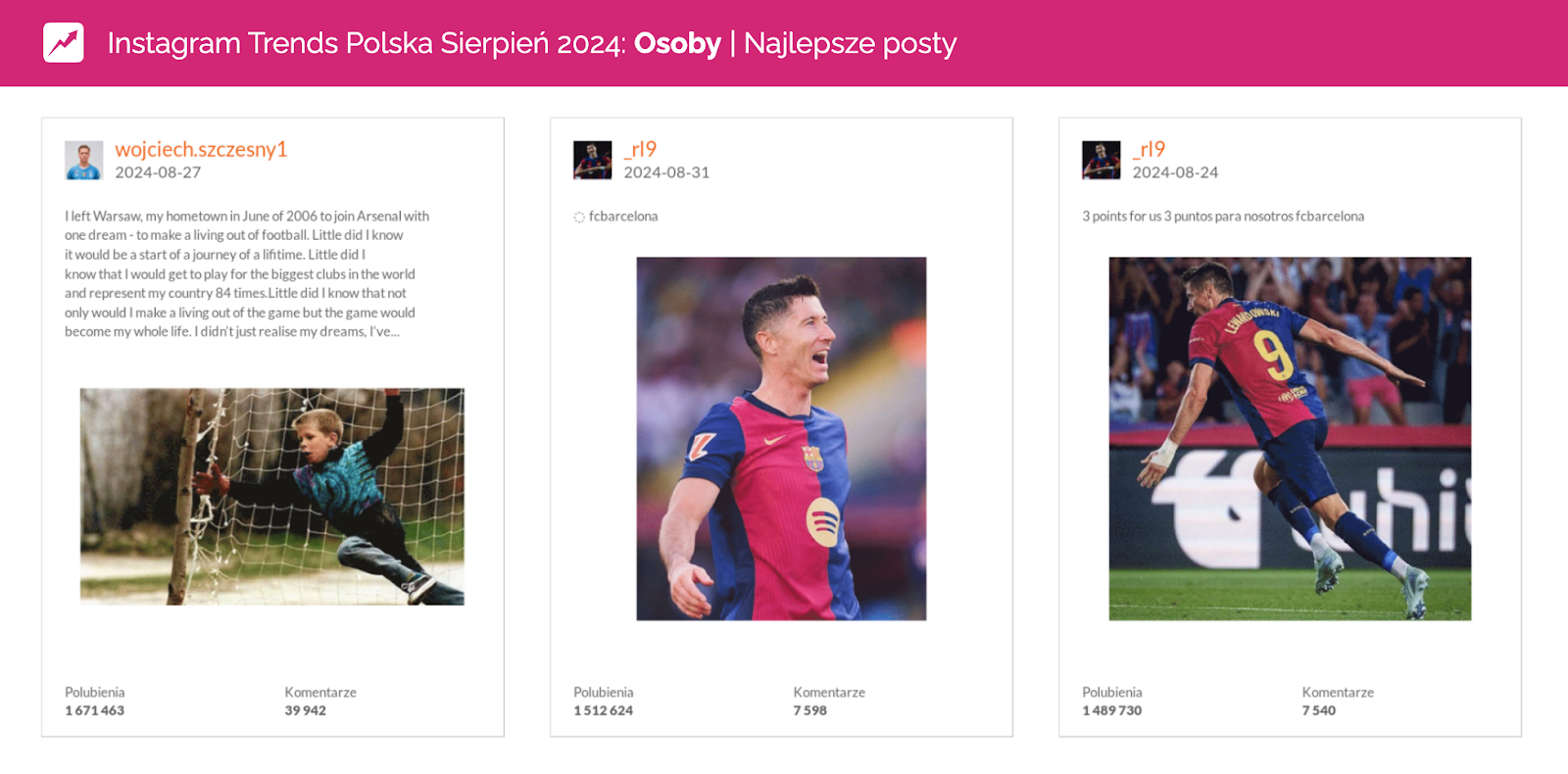 W sierpniowych rankingach nie zabrakło również Wojciecha Szczęsnego, który ogłosił na Instagramie zakończenie kariery piłkarskiej. Jego profil zdobył aż 137 tysięcy nowych obserwujących, co dało mu drugi najszybszy wzrost w miesiącu.