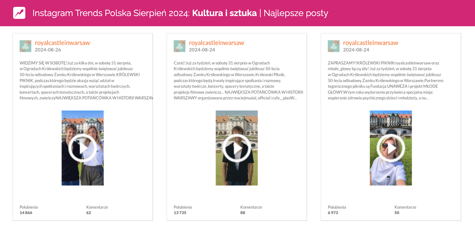 W kategorii Kultura i Sztuka profil nie miał sobie równych, zajmując pierwsze miejsce. Posty promujące obchody jubileuszu 50-lecia odbudowy zdobyły całe podium najlepszych treści, pokazując, jak skutecznie można angażować społeczność wokół wydarzeń kulturalnych.