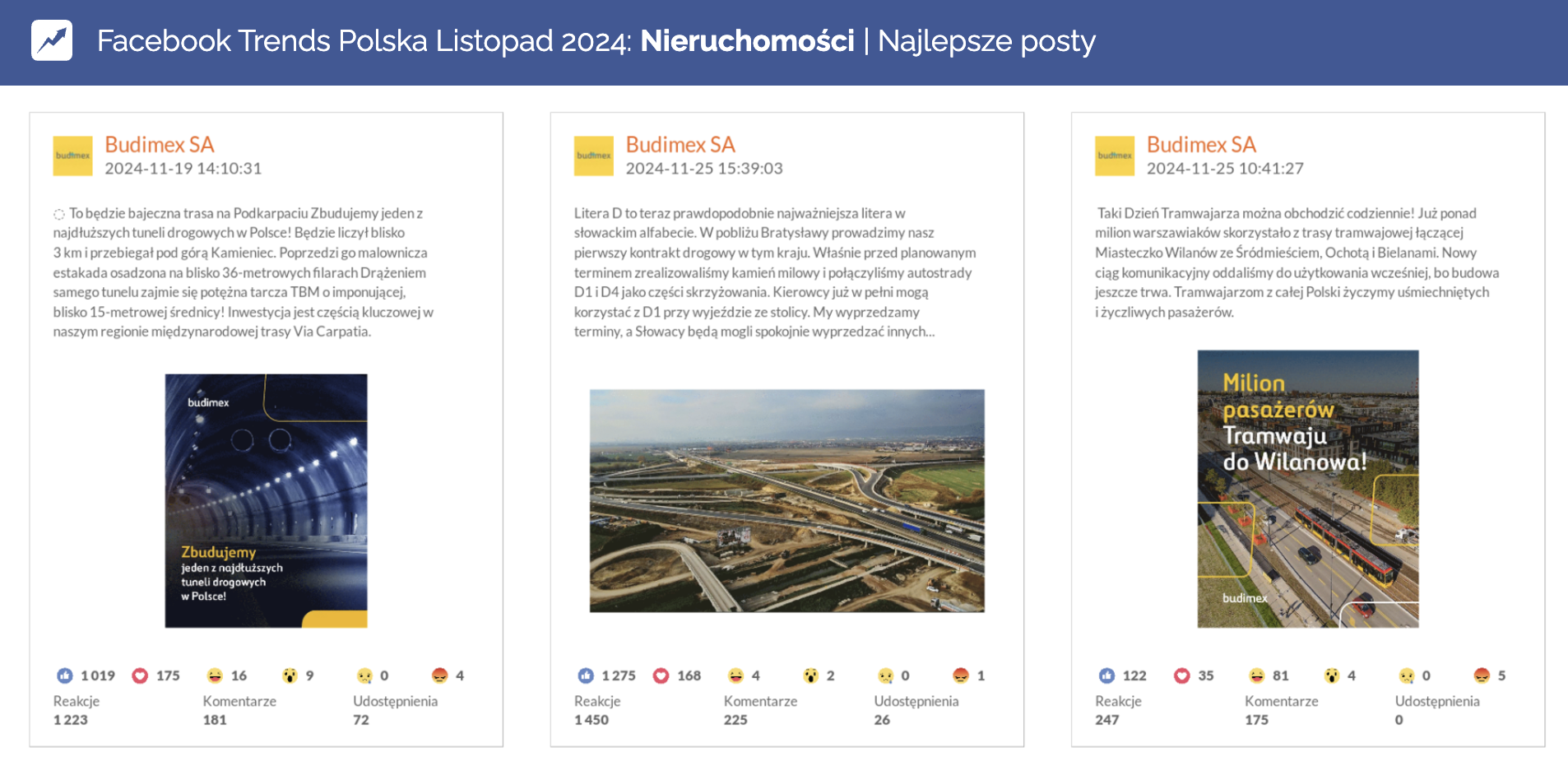 Z kolei trzy najbardziej angażujące posty w tej kategorii należały do Budimex SA. Kolejne miejsca w TOP15 zostały wręcz zdominowane przez treści z profilu Dom Development.