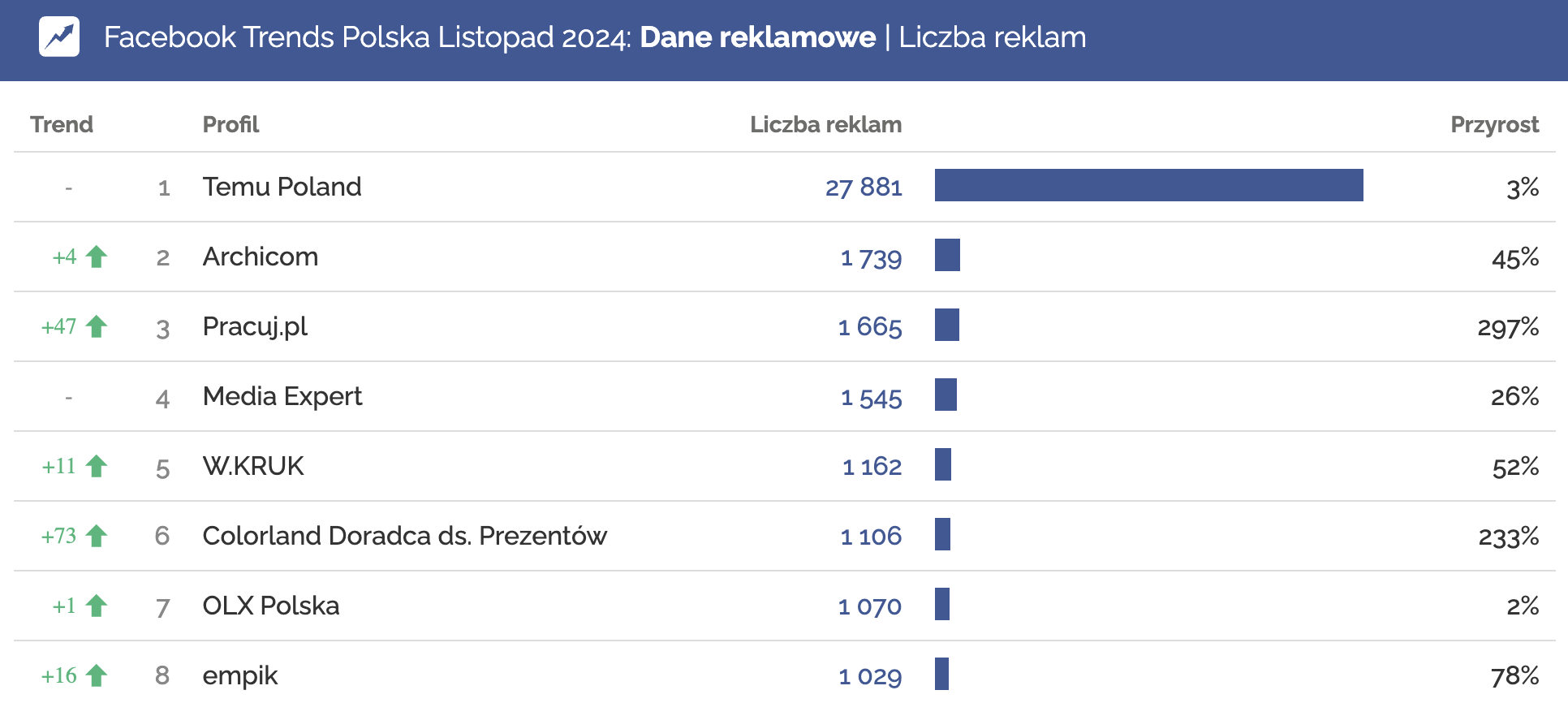 W naszym raporcie Facebook Trends doskonale widać, które z nich w listopadzie postanowiły zintensyfikować swoje działania reklamowe w ekosystemie Meta. Głównie były to sklepy e-commerce, w których możemy zaopatrzyć się w prezenty świąteczne (Colorland, Empik, W.KRUK), ale także np. Pracuj.pl czy T-Mobile.