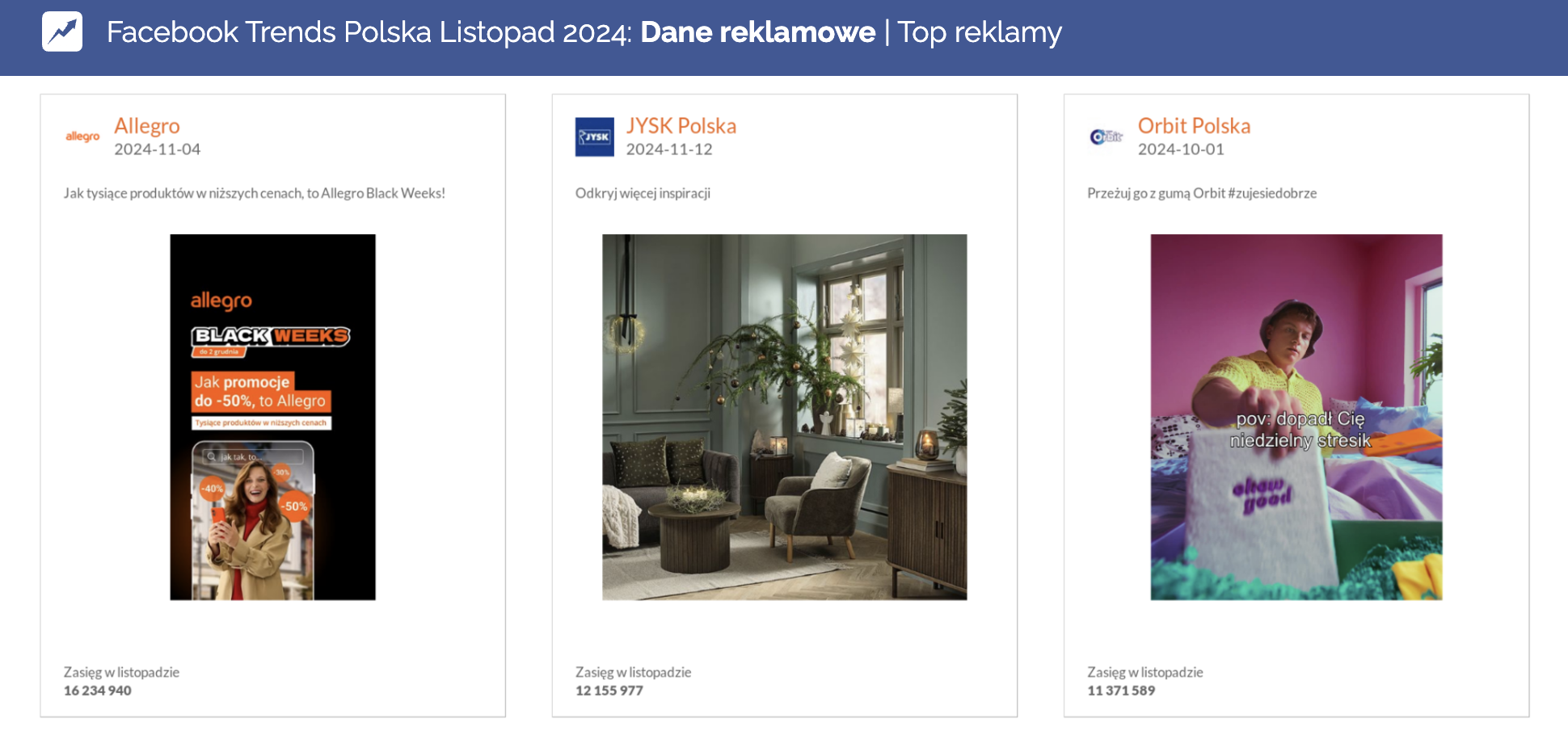 Najbardziej zasięgową reklamą była reklama Allegro, która dotyczyła Allegro Black Weeks, z zasięgiem na poziomie 16 milionów.