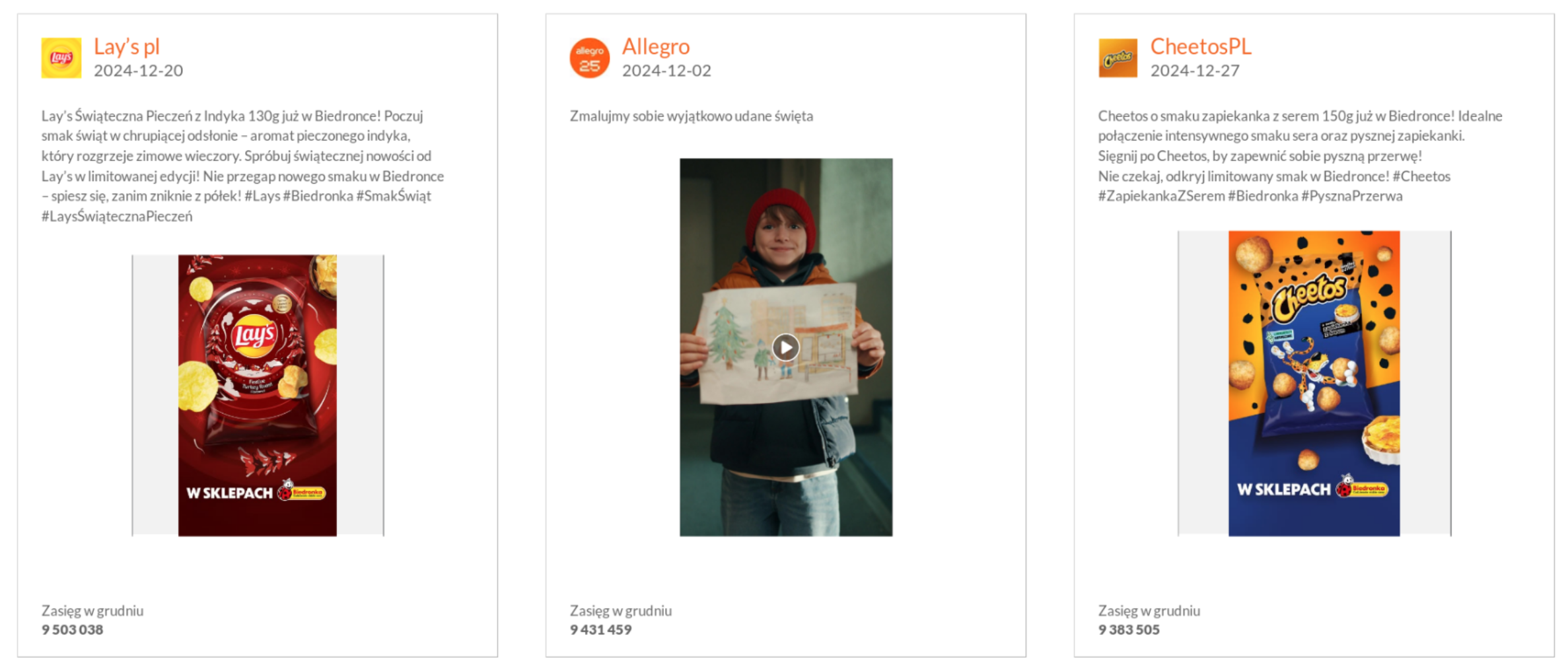 Wśród topowych reklam zdecydowanie królowały kreacje związane ze Świętami. Finlandia Vodka zachęcała do celebrowania z ich produktem, a marka Lay’s promowała limitowaną edycję chipsów o smaku Świąteczna Pieczeń z Indyka. Wśród najlepszych reklam nie mogło zabraknąć także poruszających świątecznych kampanii storytellingowych od Allegro.