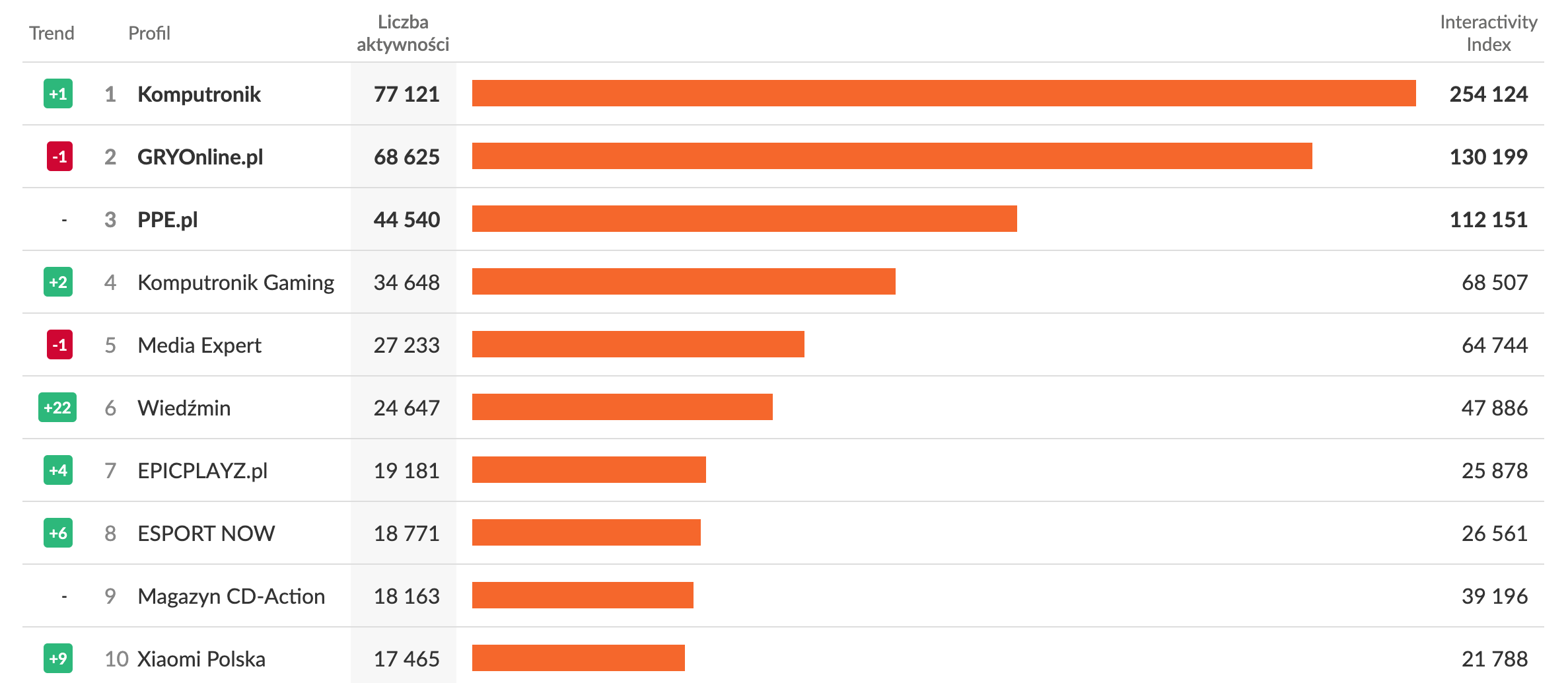 W kategorii Technologie i sprzęt największym zainteresowaniem w tym miesiącu cieszył się profil gry Wiedźmin, który awansował o 22 pozycje w rankingu aktywności, zajmując 6. miejsce.