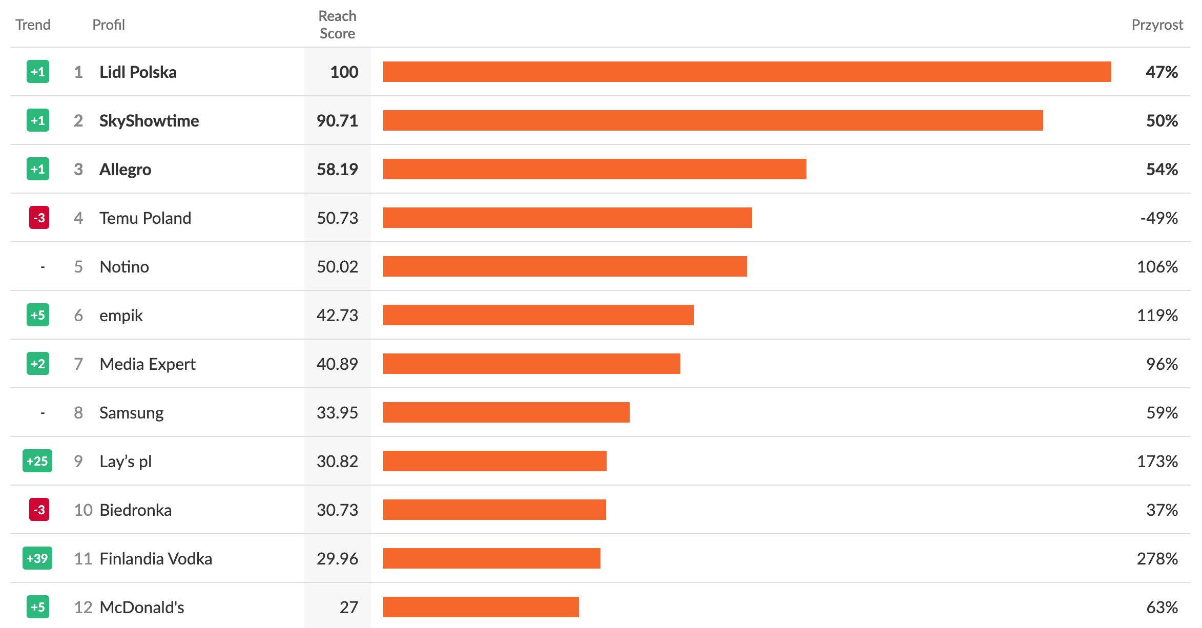 W grudniu największy przyrost Reach Score zanotowała Finlandia Vodka, co pozwoliło marce awansować o 39 pozycji, zajmując 11. miejsce w rankingu. Imponujący wzrost osiągnął także profil Lay’s Polska, z przyrostem Reach Score o 173%, co przełożyło się na awans o 25 miejsc na 9. pozycję.