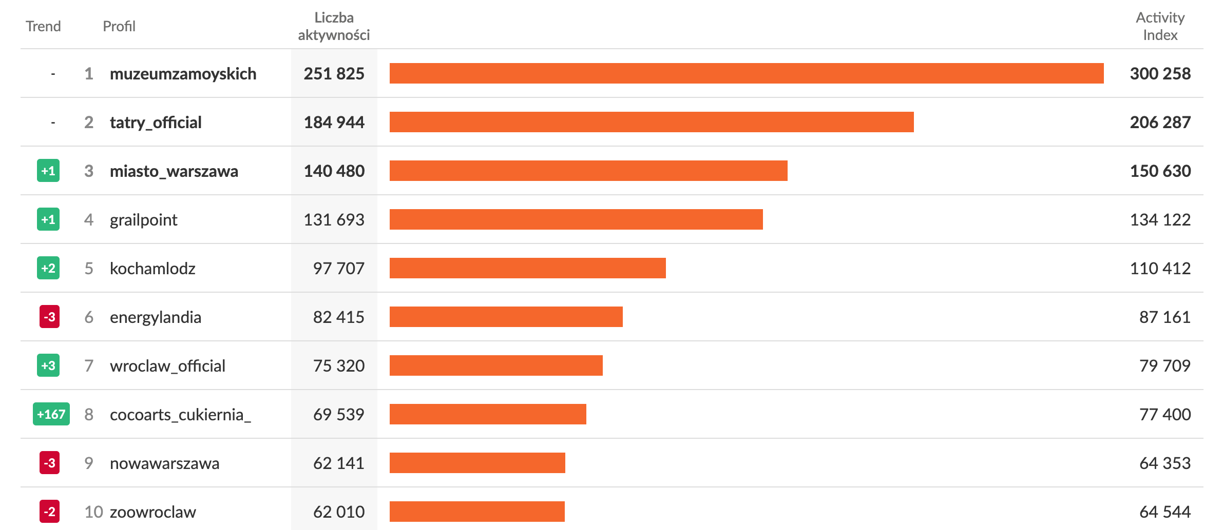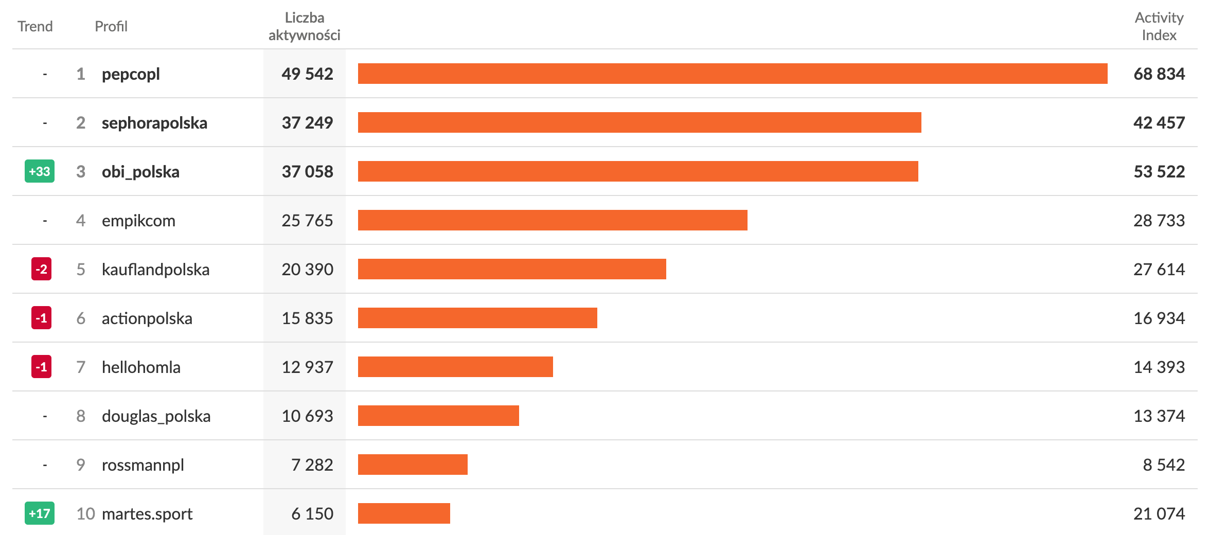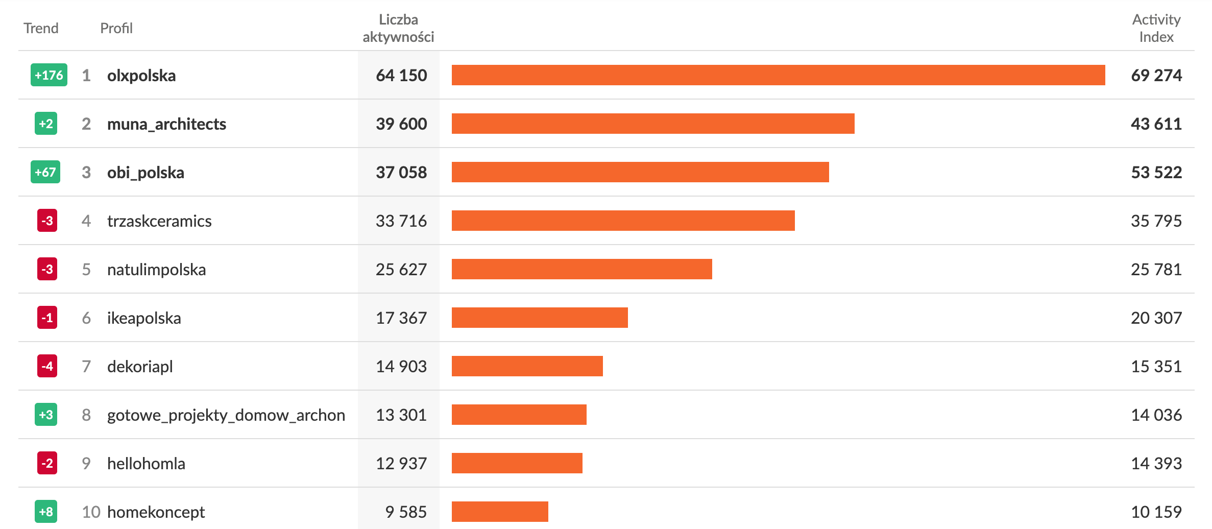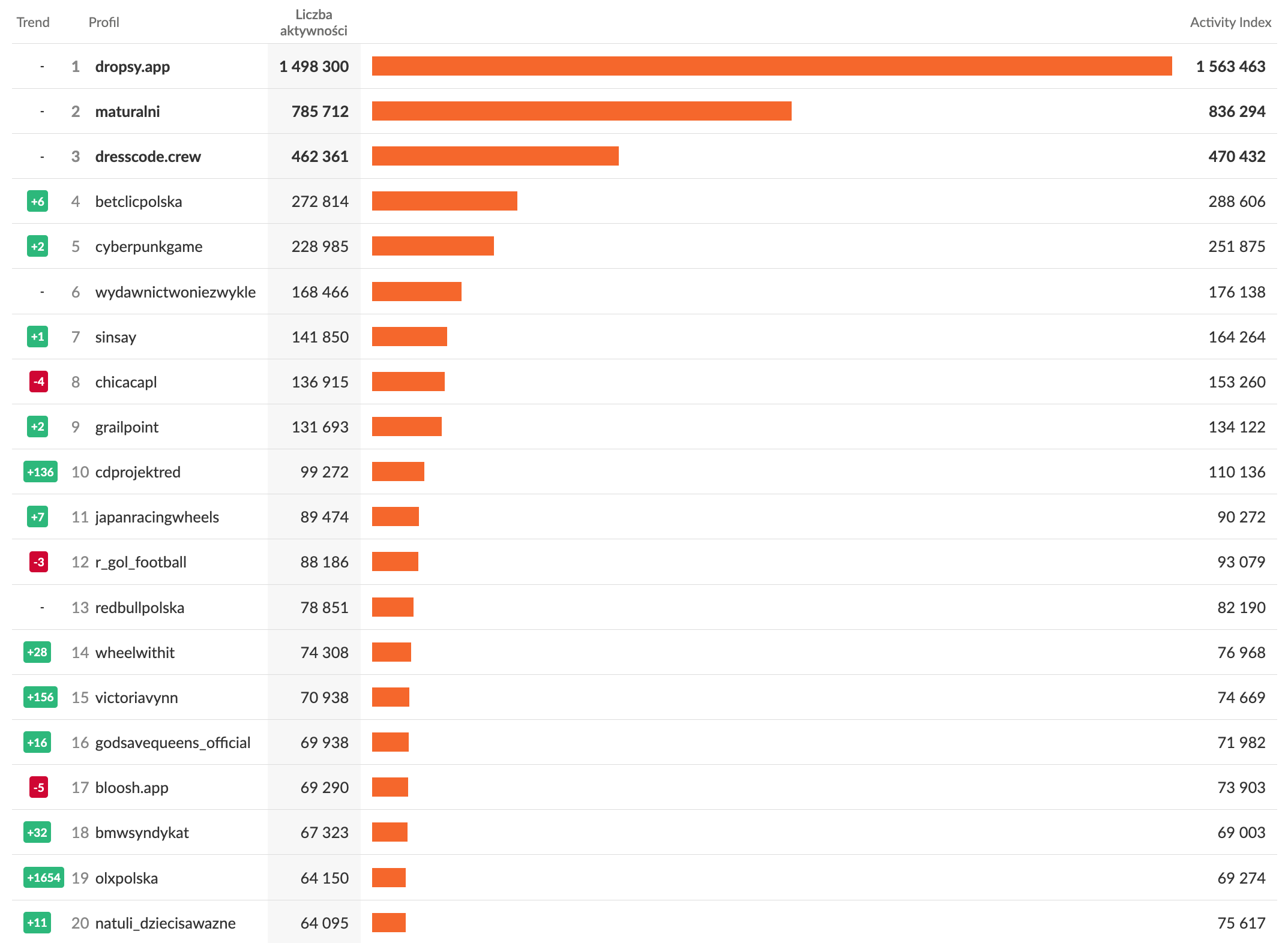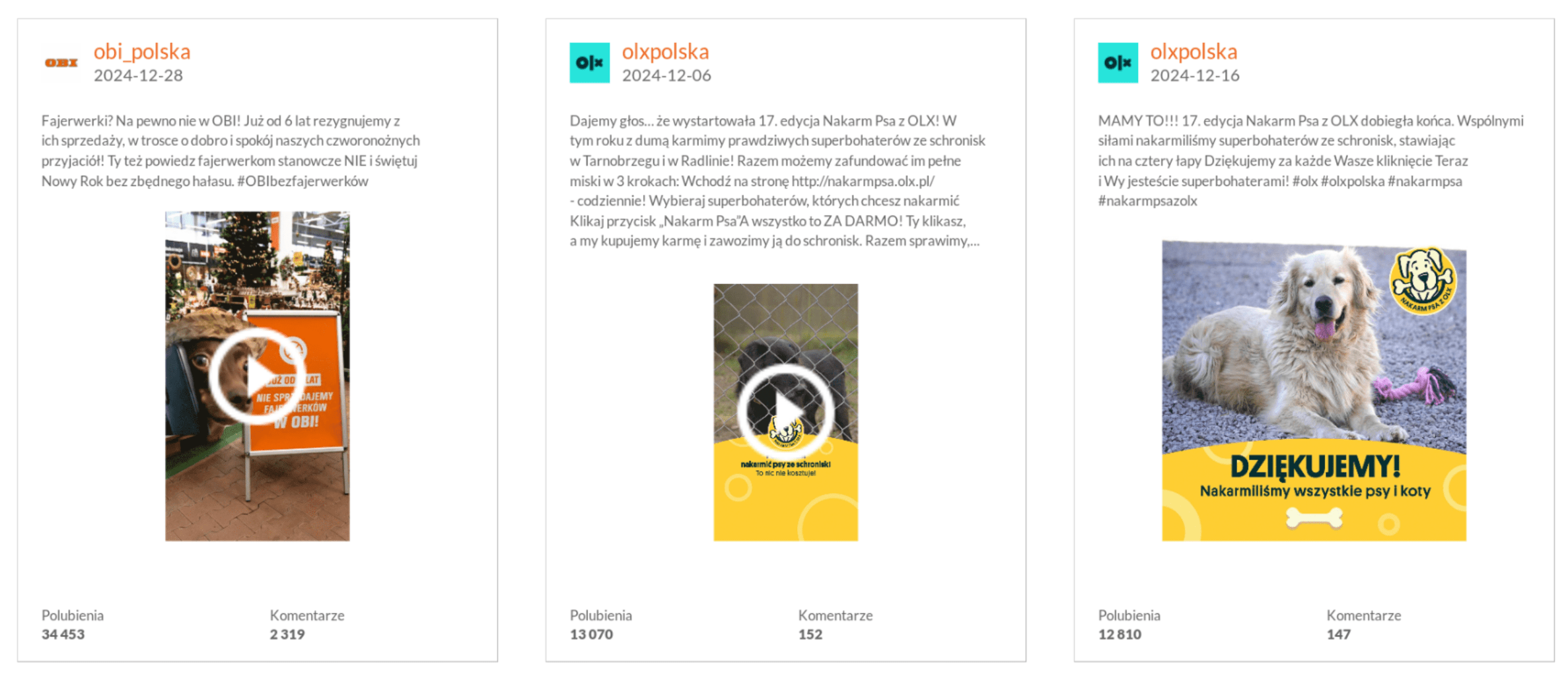 W grudniowym zestawieniu w kategorii Marki zdecydowanie wyróżnił się profil @olxpolska, który zaliczył spektakularny awans o 1654 pozycje, wskakując na 19. miejsce w rankingu aktywności. Ogromny skok to efekt kampanii związanej z 17. edycją akcji Nakarm Psa z OLX (i tym razem także kota!).