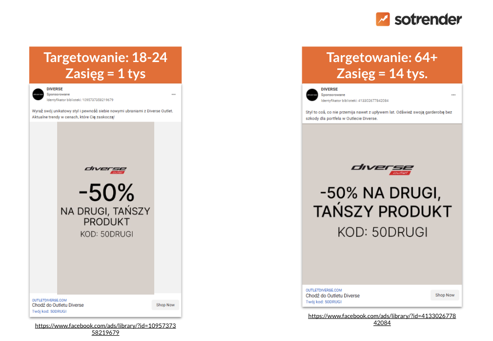 Choć zdarza się, że wykorzystuje się takie same kreacje do różnych grup wiekowych, inna może być treść reklamy, co widać na przykładzie DIVERSE, marki odzieżowej (“Wyraź swój unikatowy styl” vs “Styl to coś, co nie przemija”).