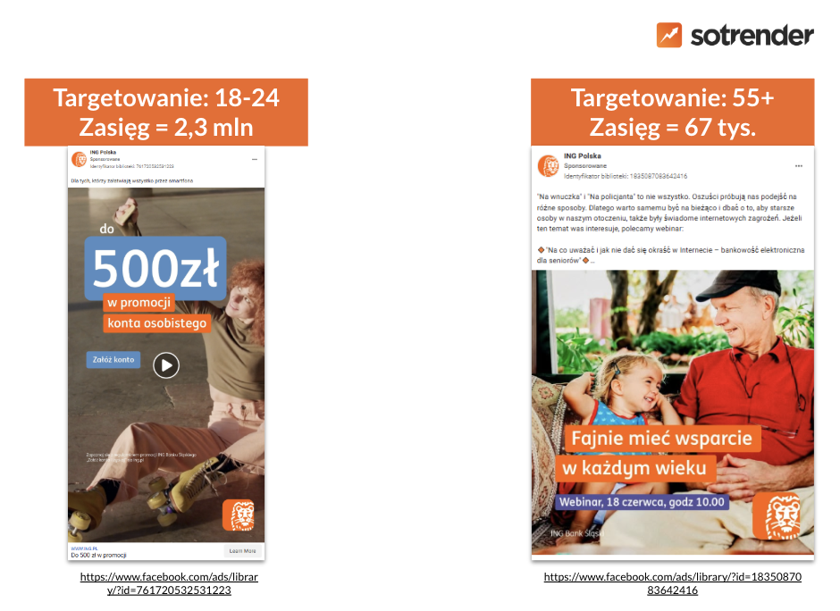 Na przykładzie ING Polska widzimy, jak na poziomie zarówno kreacji, jak i treści reklamy przedstawiane i komunikowane są zupełnie różne produkty i usługi skierowane do różnych generacji. Identyfikacja potrzeb i wyzwań obu grup (“Dla tych, którzy załatwiają wszystko przez smartfona” vs “Fajnie mieć wsparcie w każdym wieku”) czyni te reklamy skutecznymi.