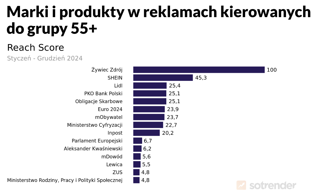 Największe zasięgi reklam kierowanych do grupy 55+ w 2024 roku osiągnął zdecydowanie Żywiec Zdrój, a, co ciekawe, na drugim miejscu znalazło się SHEIN. W zestawieniu pojawiło się również sporo podmiotów (i ich produktów) ze sfery publicznej (Obligacje Skarbowe, mObywatel, Ministerstwo Cyfryzacji).