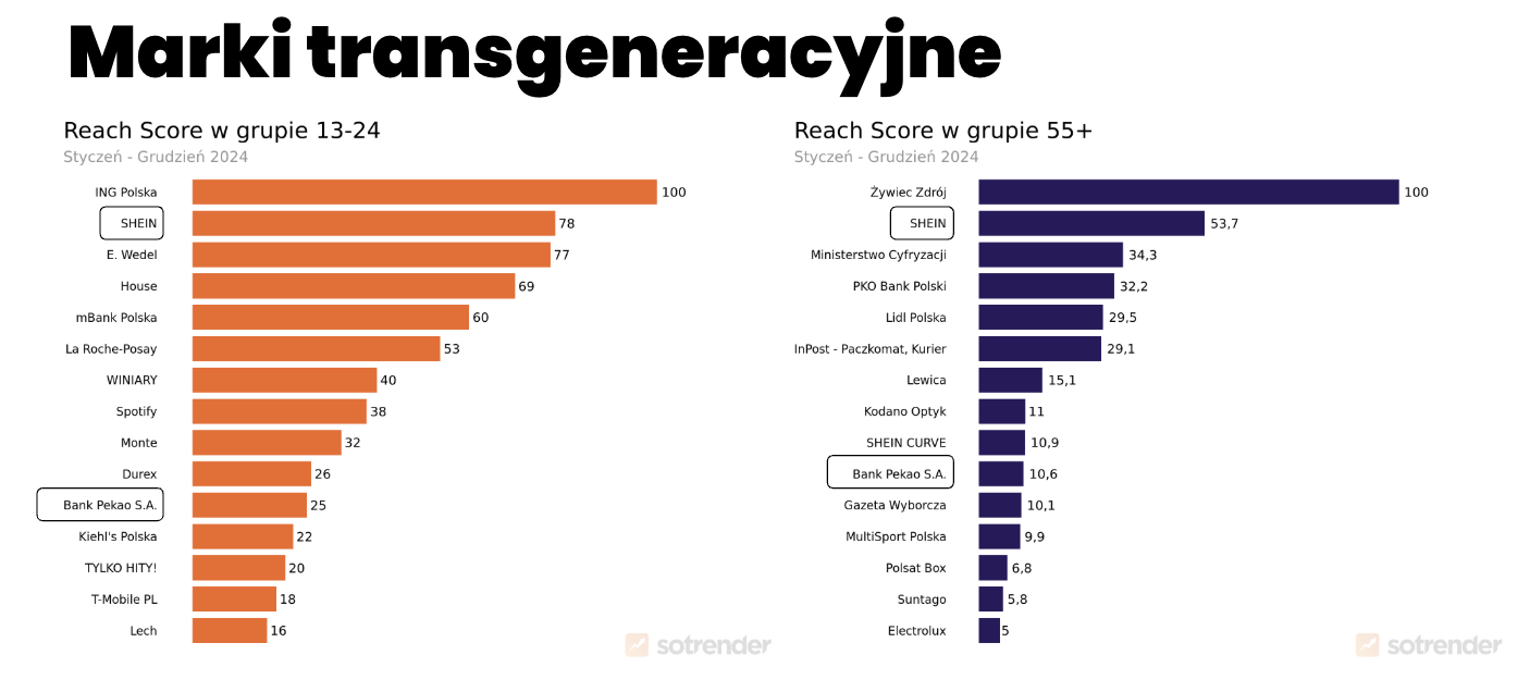 Patrząc na konkretne marki, które wykazywały szczególne zainteresowanie grupą najmłodszą i najstarszą, widoczna jest duża różnorodność. Jednak dwa brandy starały się intensywnie docierać do odbiorców z obu grup – był to chiński SHEIN oraz Bank Pekao S.A.
