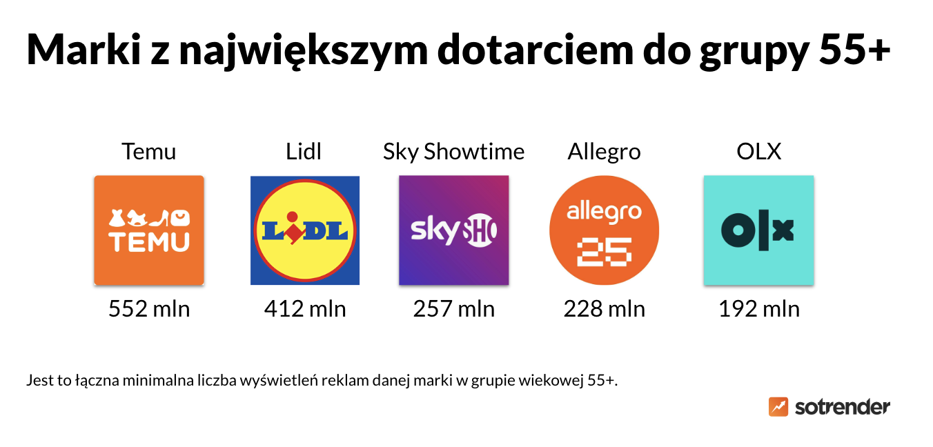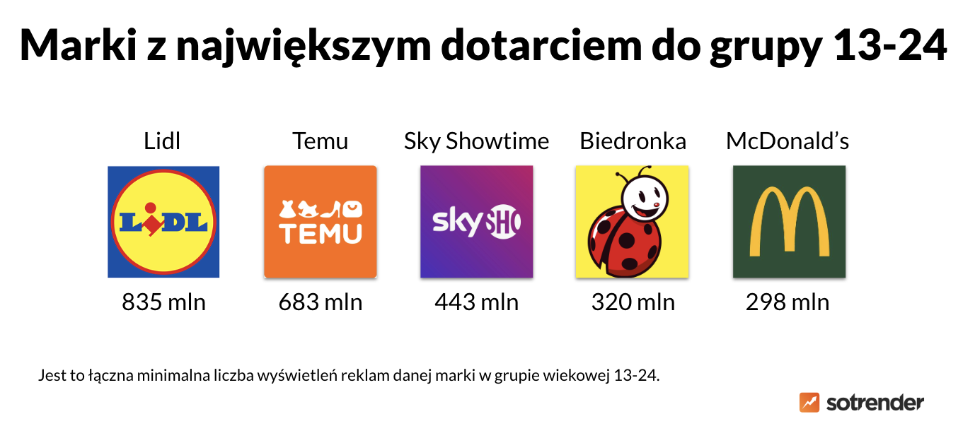 W tym przypadku sytuacja wyglądała podobnie jak w przypadku najmłodszych odbiorców – na prowadzeniu bez zmian znalazło się Temu, Lidl i SkyShowtime. Biedronka i McDonald’s zostały jednak zastąpione przez polskie platformy zakupowo-sprzedażowe – Allegro i OLX.