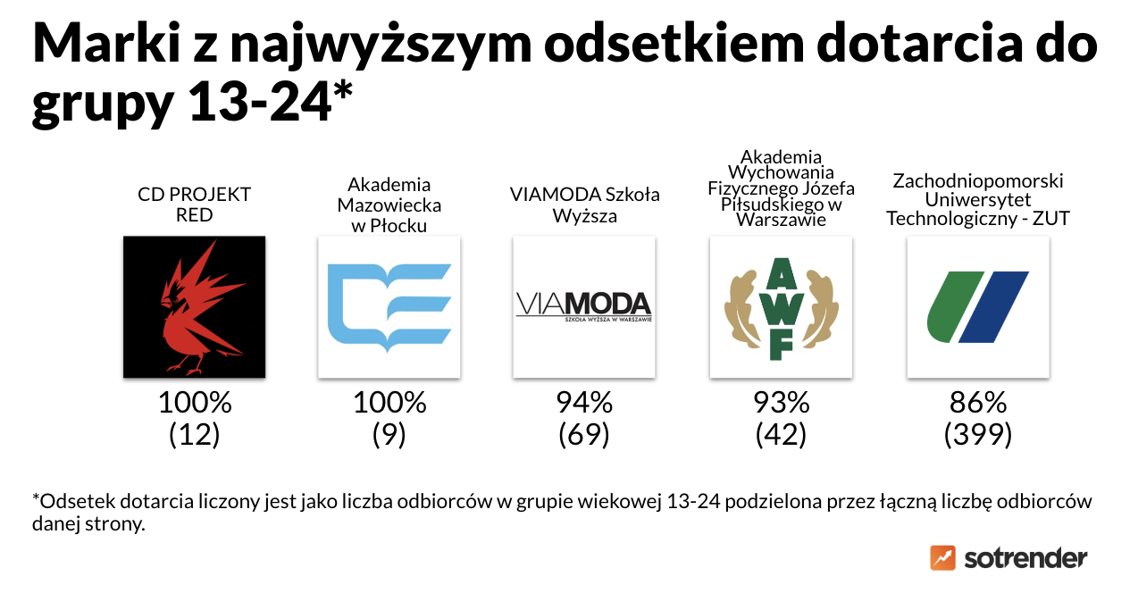 Tu sytuacja wygląda zupełnie inaczej – są bowiem marki, które w 100%, lub niemal w 100%, wyświetlały swoje reklamy właśnie najmłodszym odbiorcom. Był to przede wszystkim CD PROJEKT RED oraz uczelnie.