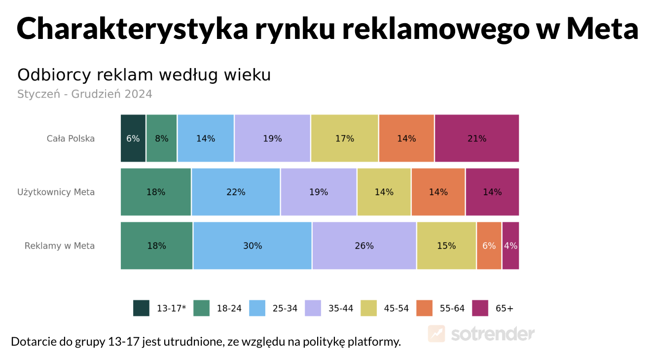 Choć na Facebooku i Instagramie znajdziemy niemal wszystkich, demografia targetowania reklam jest nieco skrzywiona przez nadreprezentację osób w średnim wieku. W 2024 roku, ponad 55% reklam kierowanych było do odbiorców w wieku 25 – 44 lat. Z drugiej strony stosunkowo mały procent reklam kierowany był do osób najstarszych. Zaledwie 10% reklam targetowanych było na odbiorców powyżej 55 roku życia.