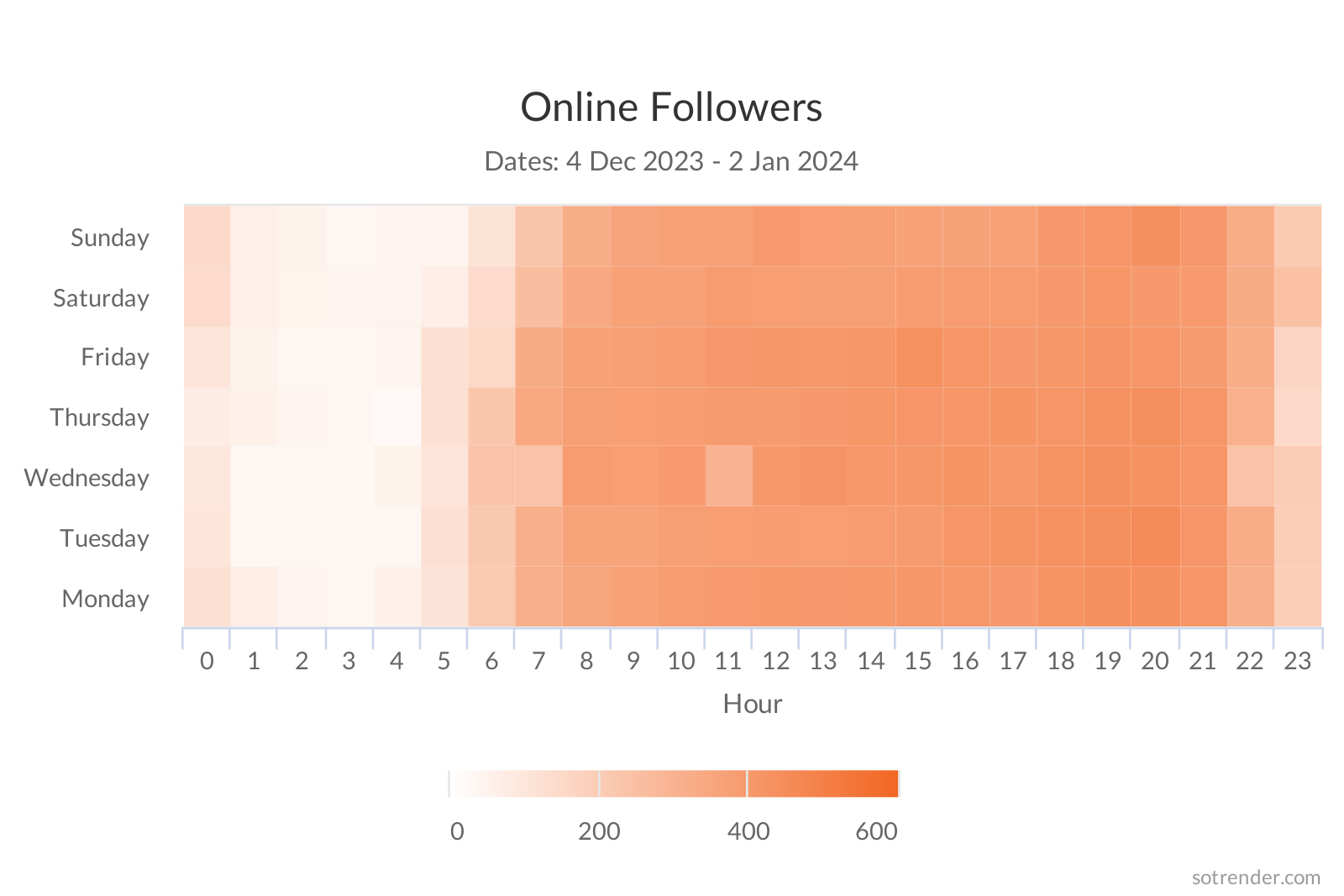 By taking a look at this chart you can find out easily on what day and what hour you have the biggest number of online followers. The more intense the color is, the better would be the time to post new content.
