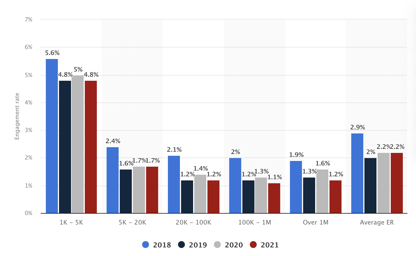 Engagement rates among Instagram influencers worldwide from 2018 to 2021, by number of followers, source