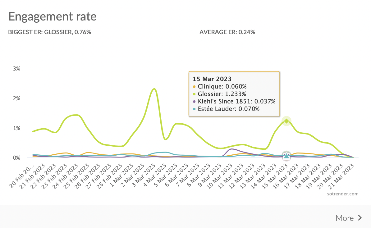 Usually, the bigger the profile, the smaller its engagement – but not in this case. Glossier has an extremely engaged community, so it’s definitely worth delving deeper into their strategy.