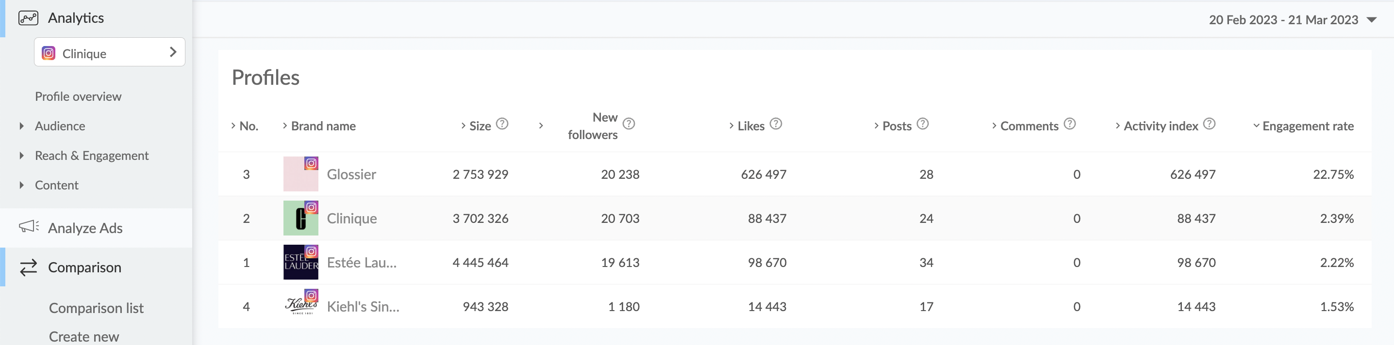 You can also create a comparison group to compare the engagement rate for a few profiles at a time.