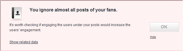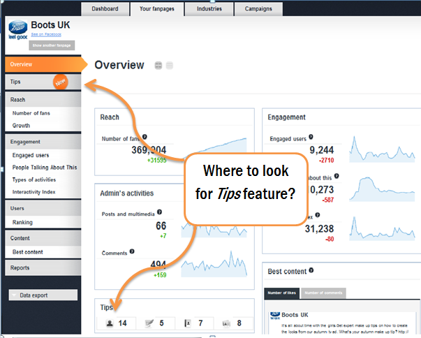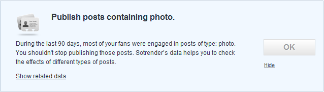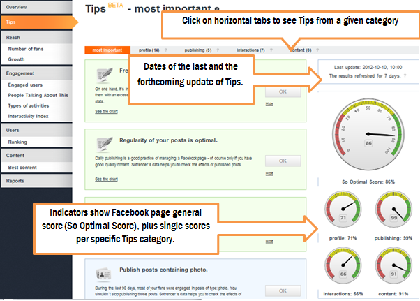Tips are transparent and easy to understand text hints helping to efficiently run a Facebook page. If you have never used Sotrender before, Tips are a good point to start with. Without the necessity of analysing charts and getting into details of complex statistics you get an entire set of hints telling you what to do and what should come to your attention. By mean of Tips feature Sotrender helps to put into action Facebook page analysis without requiring any complex, analytical competences. Tips are perfect for people who has to monitor and control what is happening on their Facebook page but can’t dedicate to this activity much time.