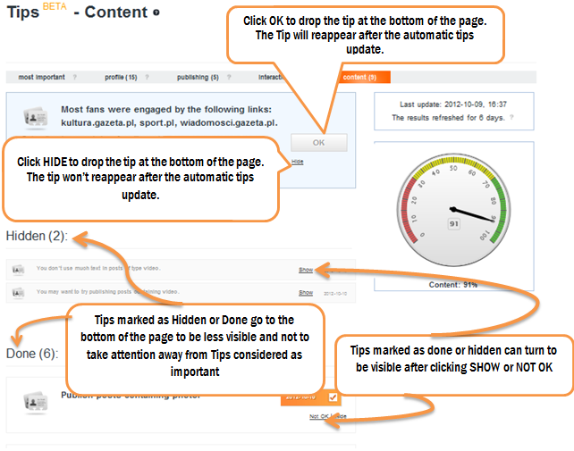 First of all feature Tips is a set of text hints applying to a specific Facebook page monitored via Sotrender. They help to optimize your actions on Facebook, making them more well-thought-out and less chaotic. Descriptions, via Tips feature, of main Facebook page components enables to eliminate shortcomings but also to indicate Facebook page communication elements that are already being used properly and are giving desirable, positive results.