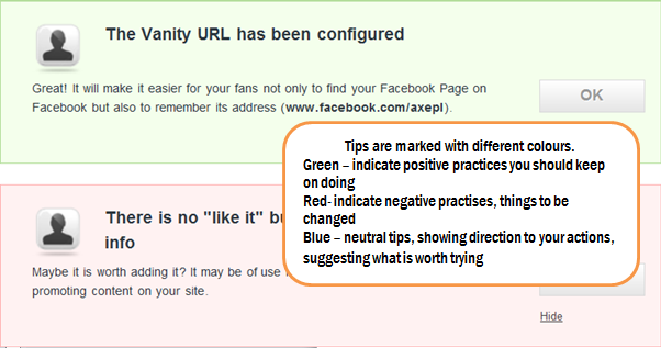 Tips are also marked with colours: green ones indicate well done actions you should keep on doing. Tips in red indicate things that should be improved or changed. Blue colour tips are neutral ones advising direction of your actions.