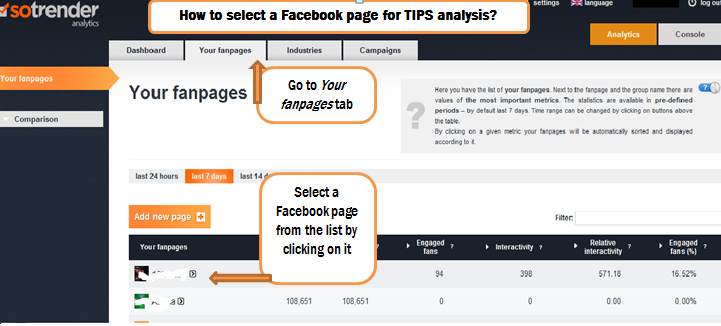 1. Choose a Facebook page you want to monitor. The list of Facebook pages pinned to your account you’ll find under the tab your fanpages- upper part of the site. Sotrender allows to view Tips for  all Facebook pages monitored within a Sotrender account, no matter whether they are ours or our competitors. After clicking on a chosen profile Sotrender will take us to the tab Overview.