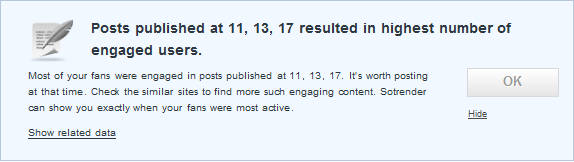 It is worth to appoint which posts provoke the most vivid fans reaction. Tips will help you to understand how to post to gain the best results. Basing our knowledge on analysis of already published posts you’ll get a tip telling you during which days and hours your fans are the most active. On the other hand if we don’t post during some days and hours a tip will suggest to post during that time as to check whether it may improve effectiveness of our actions.